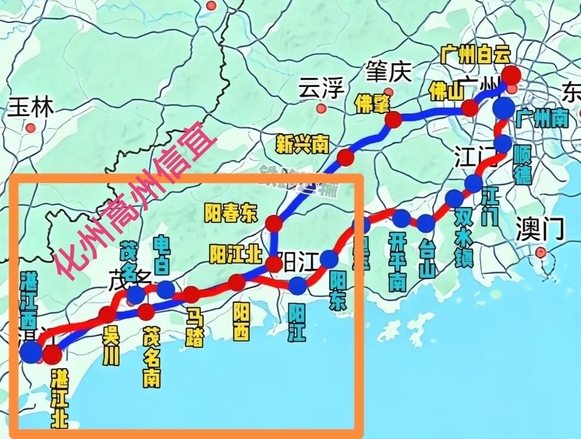 比如广湛高铁、深湛高铁,茂名刚好处于城市末端。其实湛江也是如此,两条高铁汇聚于市区。吴川位于茂名和湛江之间,其在湛江的位置就如同电白在茂名,两条高铁在此汇聚。