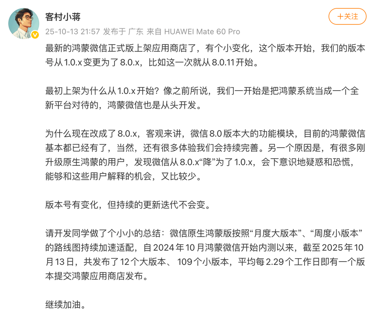 而要说鸿蒙版微信成熟标志,可能就是版本号统一的那一刻。去年刚上线时,鸿蒙版微信的版本号是1.0开头,这让用惯了安卓或iOS上高版本微信的用户心里直犯嘀咕:这会不会是个“残血版”?这种顾虑很快就被打消。微信开发团队跟上了发条似的,仅在2024年10月到2025年10月13日,鸿蒙版微信就发布了12个大版本,109个小版本。仅仅用了大半年时间,鸿蒙版微信的版本号就追平了主流平台,变成了8.0.x。聊天、支付、朋友圈、小程序、视频号……所有这些你熟悉的核心功能模块,在鸿蒙版微信上一个都没少。