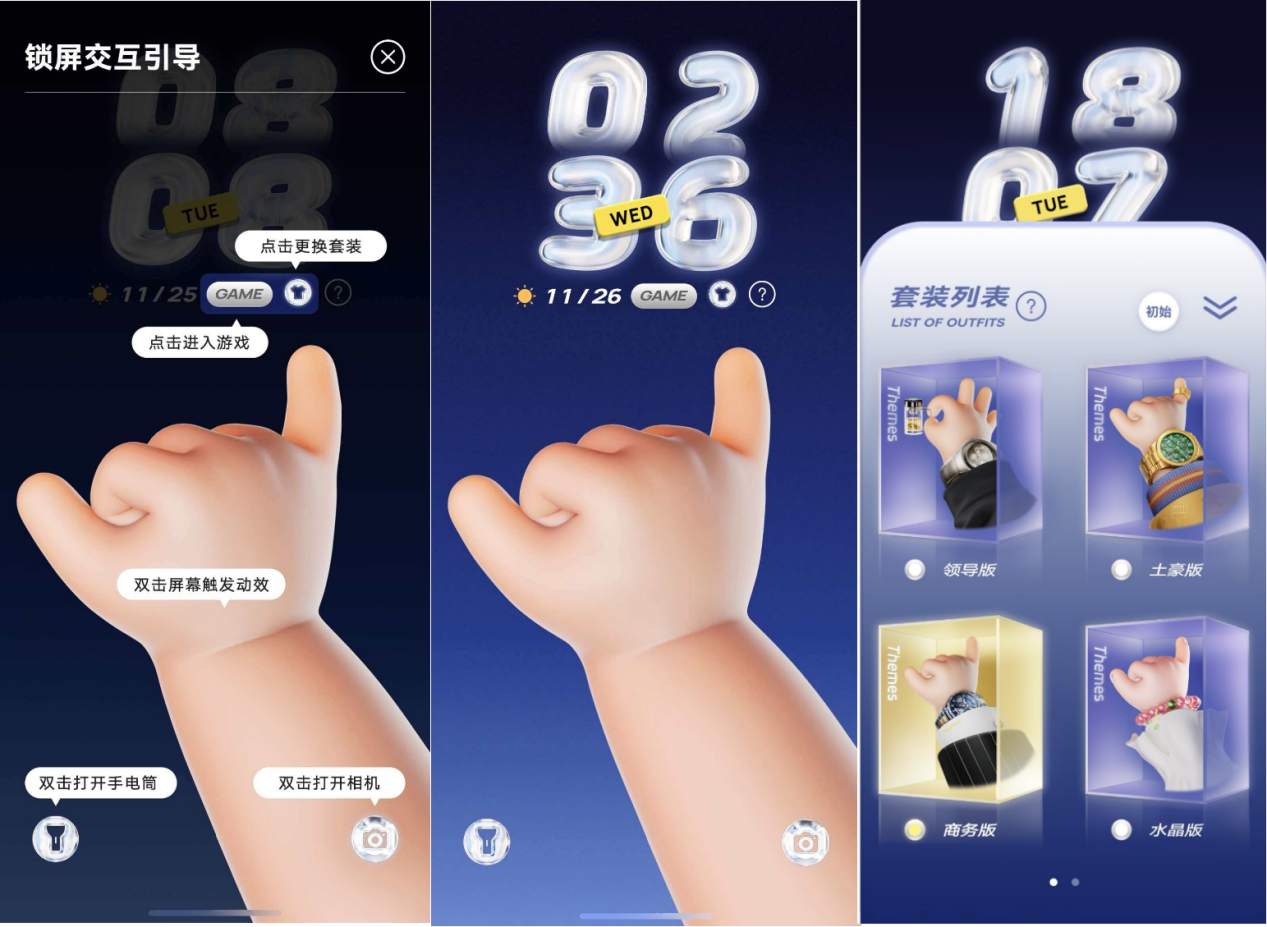 谁想到主题还能当游戏玩?早高峰挤地铁时,和小胖手猜拳就成了我隐秘的小乐趣,点亮屏幕不仅能看到小胖手和你比划“666”,还有“GAME”按钮,点一下就能玩猜拳游戏,赢了也不白赢,连赢三次就能获得新装扮,而且和之前的《小胖手》主题比,典藏版的赛博装扮可要更有质感的多,每当解锁新配饰的瞬间,那成就感让挤地铁的烦躁都少了,不过要小心,输五次会被限制换装两分钟。好几次快迟到了还在执念“再赢一局”,集齐四套装扮的那天,特意在展示柜里来回切换了好久。