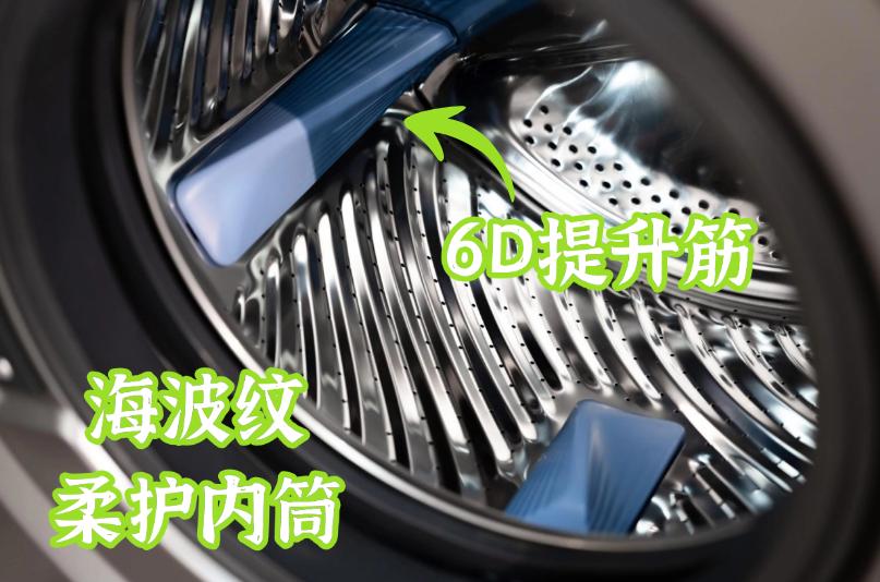 再仔细看看洗衣机的内筒,我发现TCL T7R Pro的筒壁有6D提升筋+海波纹柔护内筒组合。这6D提升筋可不是随便改的名字的,它有3组一长一短的提升筋,能在洗衣服的时候,更好地“抓”住衣服,把衣服举得更高,然后再摔打下来,好像有人在用力搓洗衣服一样,这样就能更有效地去除污渍。