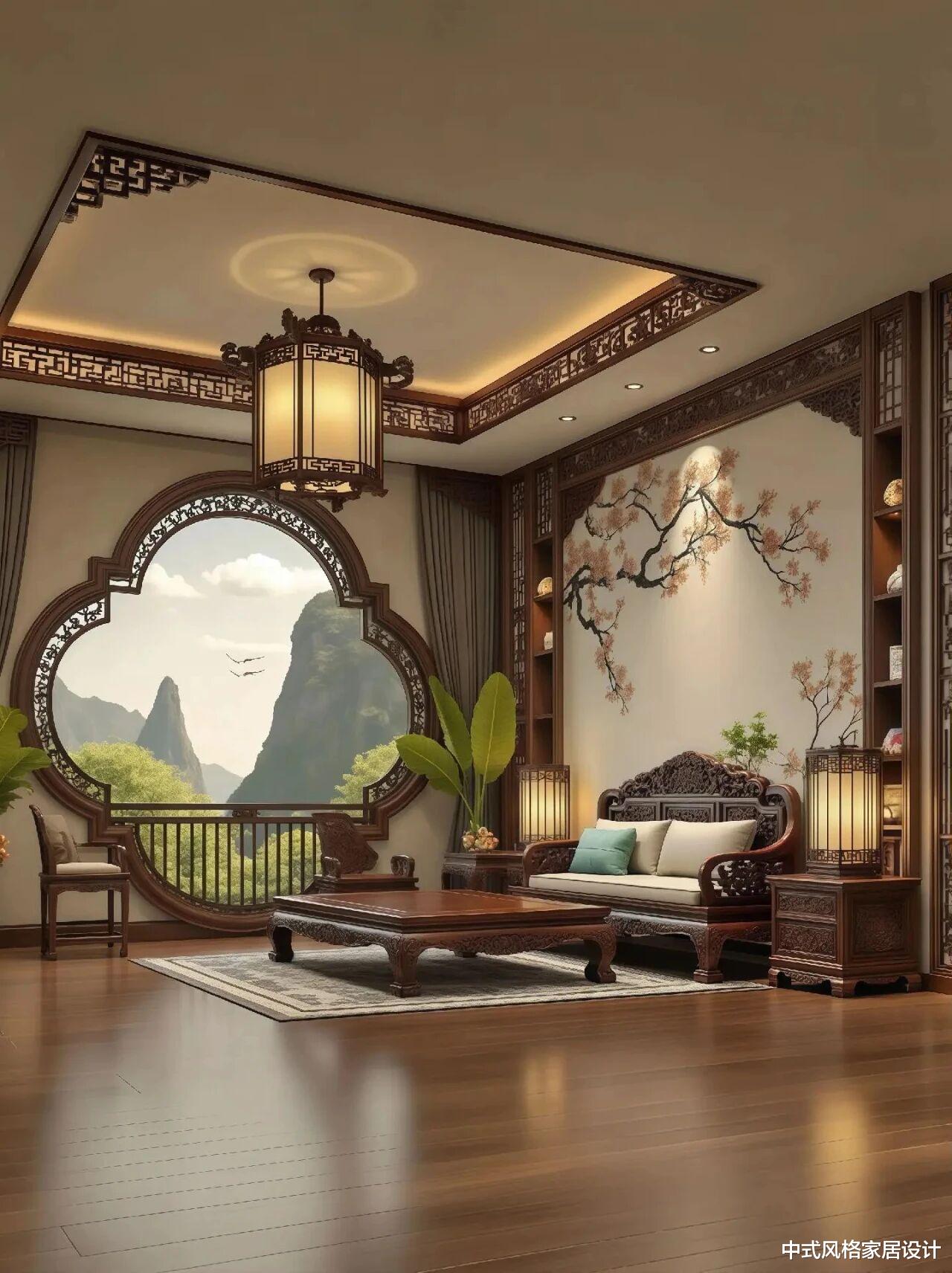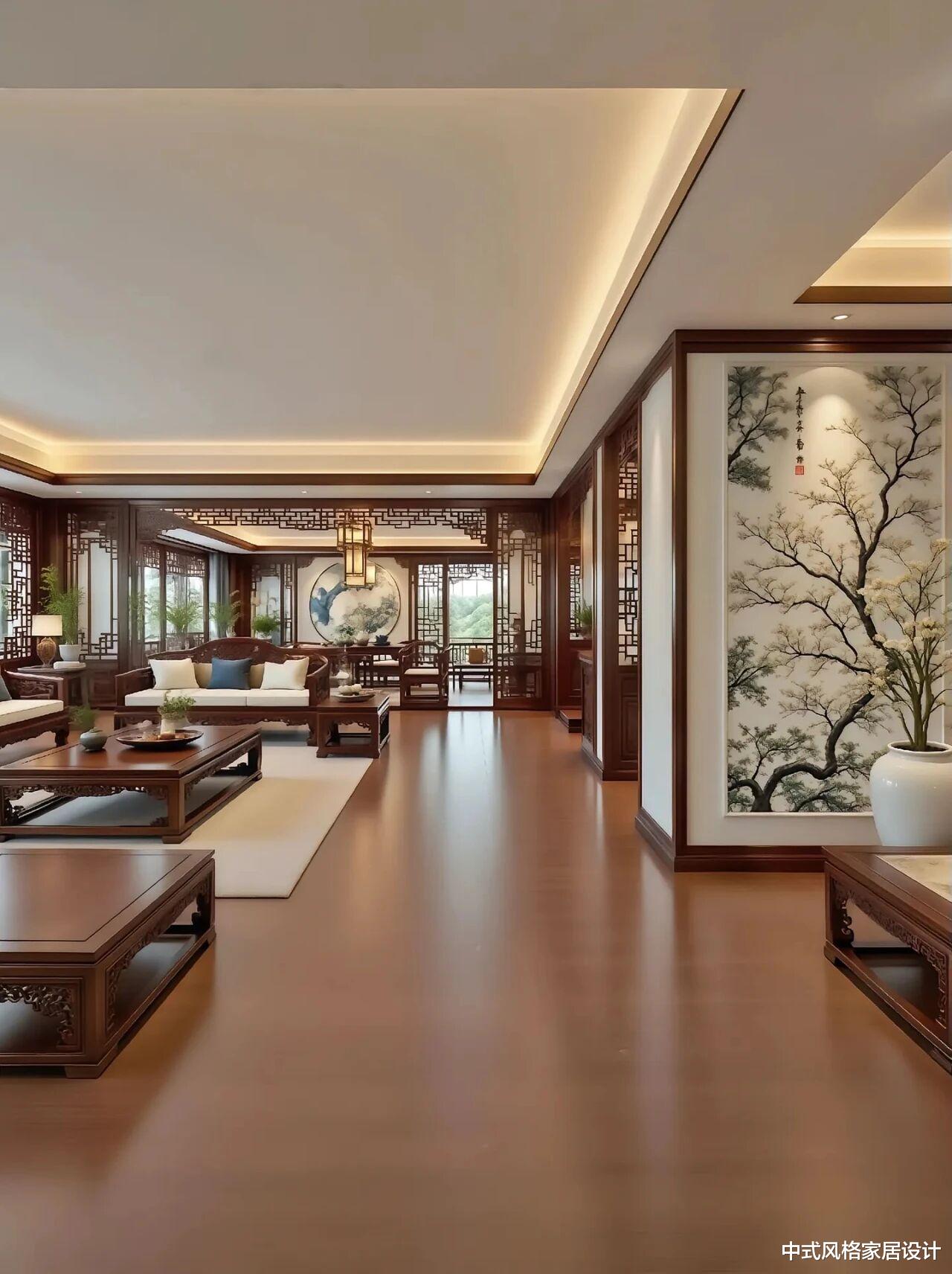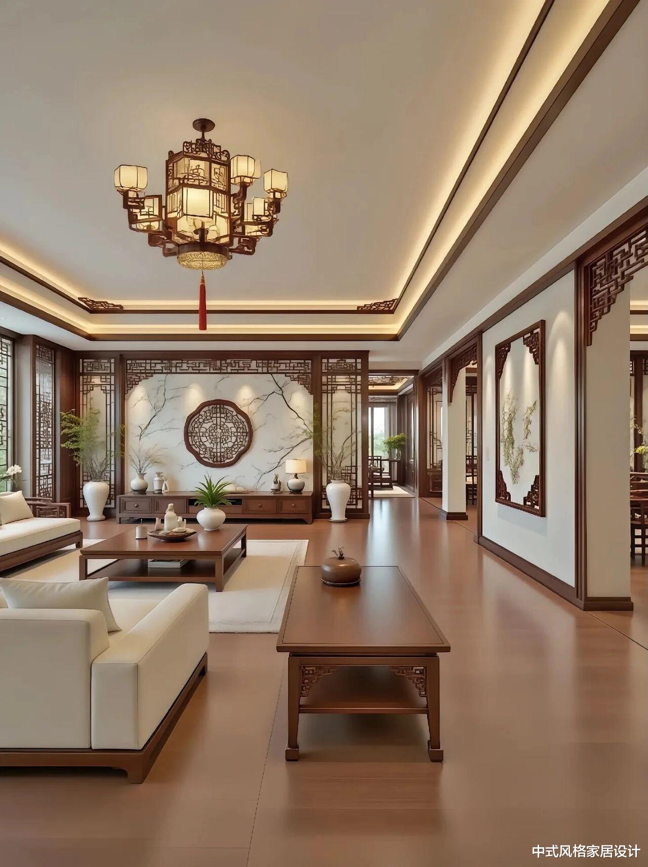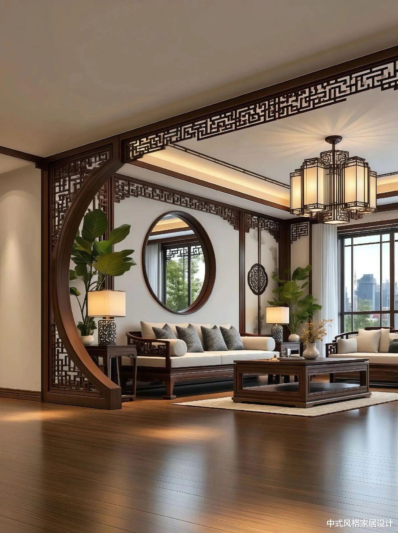 以深色实木家具为基底,搭配简约线条的吊顶与嵌入式灯光,保留“木色温润”“对称平衡”等中式经典元素,同时通过开放式布局、通透玻璃隔断弱化传统中式的厚重感,增强空间通透度。墙面悬挂水墨山水画,地面采用仿古砖或实木地板,搭配绿植,呼应“天人合一”的传统理念,营造宁静悠远的居住氛围。家具布局兼顾仪式感与实用性,如主沙发区对称摆放、茶几与边几组合,既满足待客需求,又通过细节装饰(如茶具、摆件)提升文化质感。