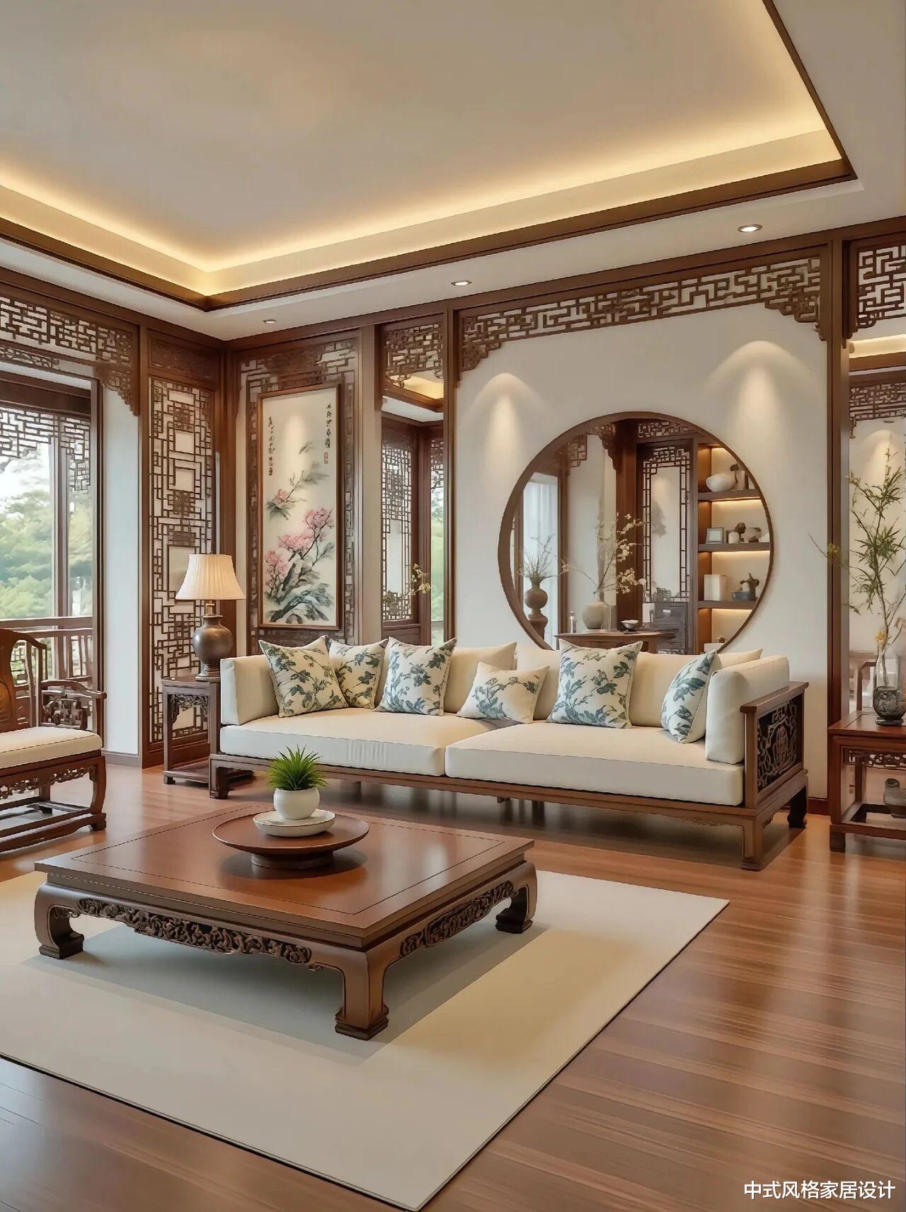 墙面采用木质格栅(如雕花窗棂)和圆形拱门设计,保留中式建筑“框景”美学;天花板与墙面衔接处有简约线条勾勒,搭配嵌入式灯光,增强层次感。主体家具为深色实木沙发,搭配米白色布艺坐垫和青花瓷纹样靠枕;茶几为传统“八仙桌”造型,桌面平整,腿部雕花精致。整体以原木色、米白、浅灰为基调,局部用青花瓷蓝、水墨画色调点缀。墙面悬挂竖幅水墨花鸟画,搭配木质边框;角落摆放陶瓷瓶插干花,茶几上置小型绿植;地面铺设浅色地毯,边缘与木质地板自然过渡。
