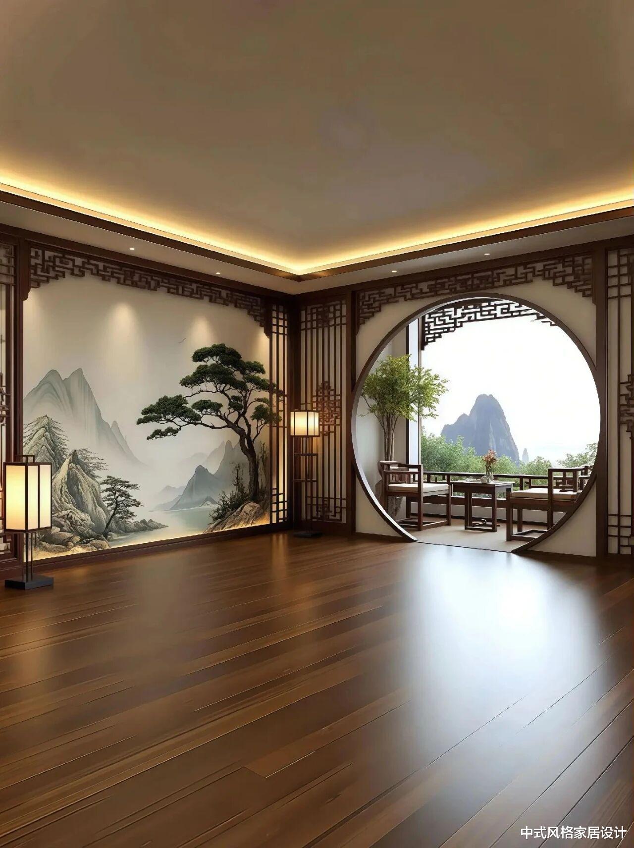 空间中央的圆形月洞门是中式设计的标志性元素,采用实木框架搭配雕花格栅,既划分了内外区域,又通过“洞”的意象形成“一步一景”的视觉引导,呼应传统园林“移步换景”的造景理念。左侧墙面以水墨山水画为装饰,远山、孤松与留白的笔触传递出中式美学中的“写意”精神,搭配木质格栅与嵌入式灯光,增强墙面的层次感与艺术氛围,与月洞门外的实景形成虚实呼应。地面采用深色实木地板,温润的木纹与整体色调统一;顶部暗藏式灯带提供柔和照明,避免强光破坏静谧感,同时突出墙面与月洞门的细节纹理,凸显传统工艺的细腻质感。