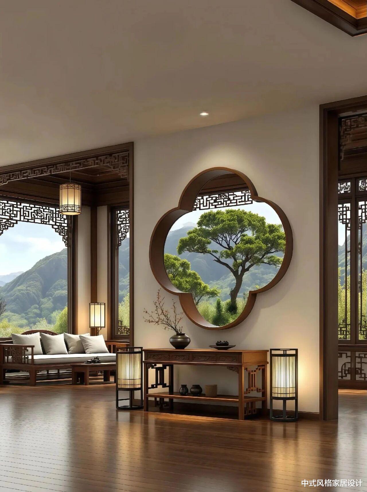 墙面中央的四叶草形镂空窗借鉴中式园林“框景”手法,将窗外自然景观引入室内;木质家具(如圈椅、长桌)保留榫卯结构,线条简洁流畅;格栅窗、灯笼造型吊灯等细节呼应传统中式符号,同时简化繁复纹饰。以原木色为基底,搭配米白墙面,局部用深色木质线条勾勒轮廓,色调沉稳和谐;地面采用实木地板,墙面为哑光乳胶漆,搭配棉麻质地窗帘,提升空间温润感。窗框内嵌入山水风景画,搭配案几上的枯枝摆件,传递“天人合一”理念;家具布局对称且留白,符合中式“藏露结合”原则,同时满足现代生活动线需求。