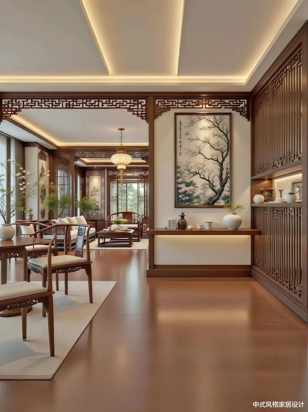 开放式与半开放式结合,通过雕花木质屏风分隔功能区,保留通透感的同时增强层次感。地面采用浅色石材与木质地板拼接,搭配米白色地毯,营造温润质感。墙面悬挂水墨山水画,搭配青瓷瓶、陶罐等中式摆件,传递“诗中有画,画中有诗”的意境。木质家具(茶桌、圈椅、博古架)以原木色为主,线条简洁流畅,保留传统榫卯结构细节。顶部采用嵌入式灯带与中式吊灯组合,暖黄色灯光柔和洒落,凸显木质纹理与水墨画的墨色层次,营造静谧、放松的品茗氛围。
