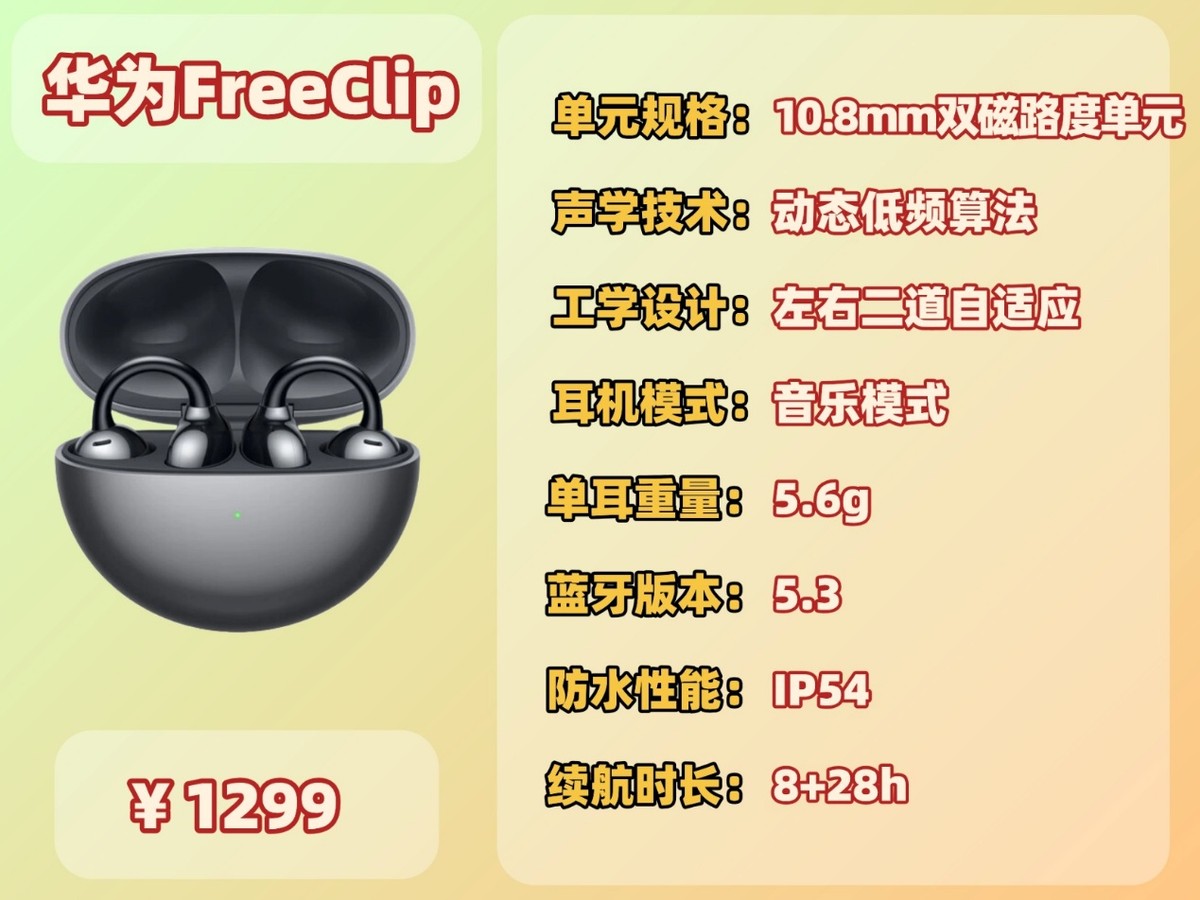 华为FreeClip这款耳机,整个耳机仅有5.6克的重量,佩戴体验很不错,结构上采用的是C型桥结构,还有TUP柔性亲肤材质加持,耳机能够完美的贴合耳部轮廓,佩戴时非常稳固,就算是在运动的时候也不会轻易脱落,长时间的体验感还是很不错的,音质上采用的是10.8mm双磁路动圈单元,还采用了搭配动态低频算法技术,三频衔接的十分自然,低频的量感也很不错,整体听感偏向于通透细腻。还采用了蓝牙5.3芯片,支持多个设备之间无缝切换,还有IP54级的防尘防水效果,能满足日常使用的场景,单次续航可达7个小时,结合充电仓使用可达36小时。