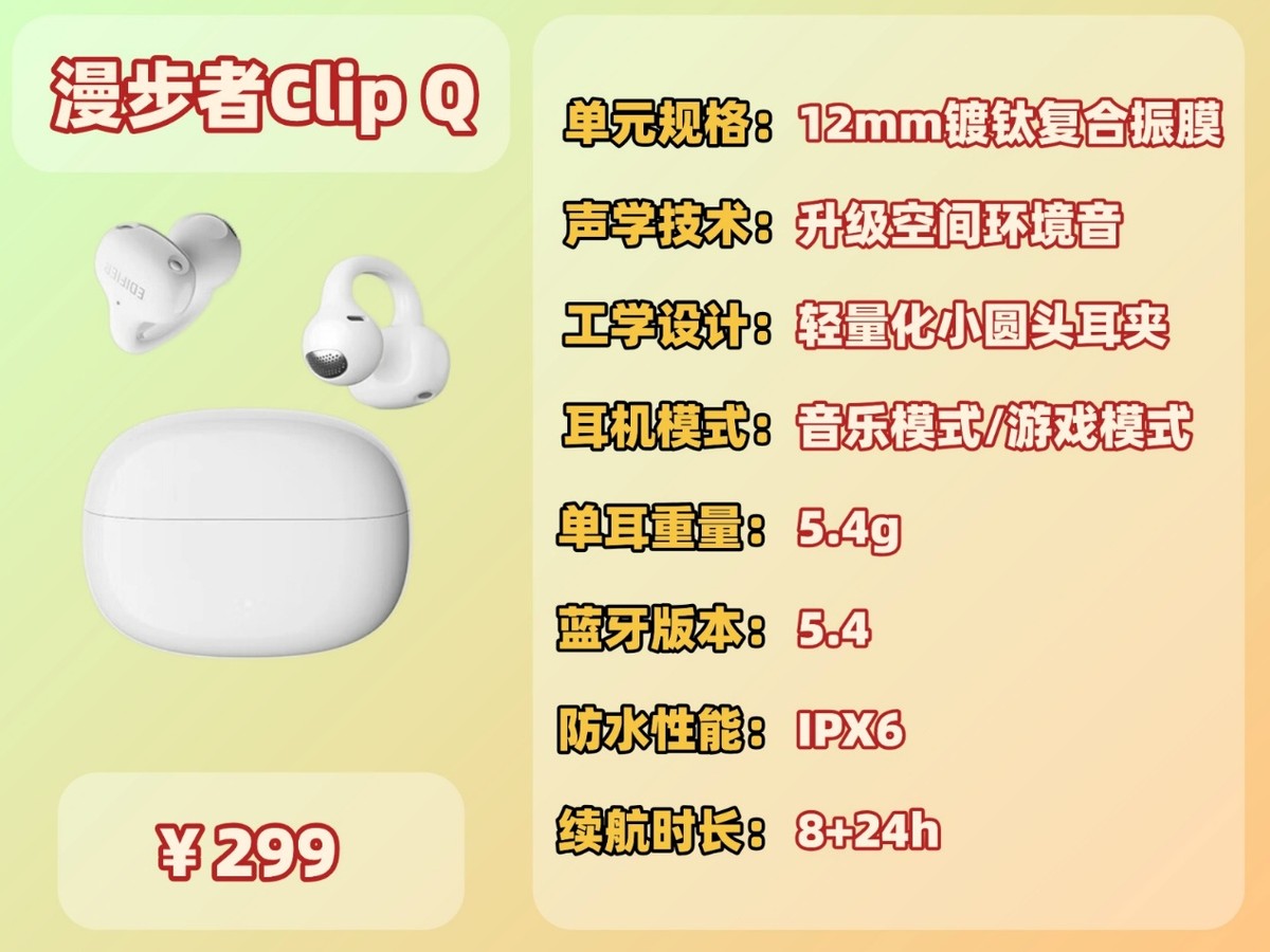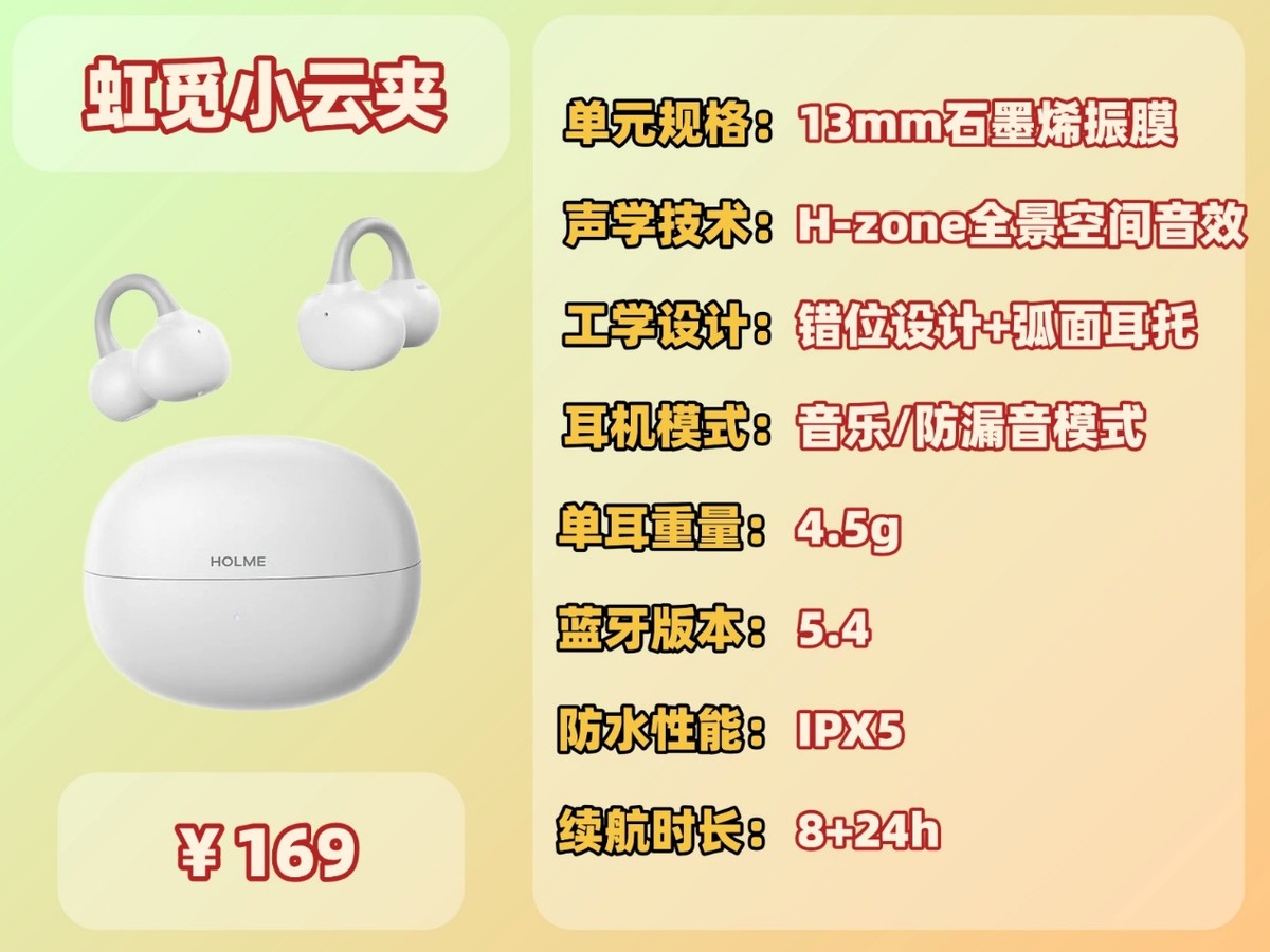 对性价比要求高的用户不妨考虑一下虹觅小云夹,169元的定价真的可以说是百元档“全能王”。单耳采用4.5g的轻量化设计,搭配前高后低2.5mm错位结构与∠12工学弧面耳托,耳机能完美贴合耳廓,久长时间佩戴也不会觉得会夹耳朵,13mm石墨烯科技振膜加持H-zone全景空间音效,独特的形变优势,可以清晰的展示出声音中的丰富细节,整体的听感偏向于饱满立体;还搭配了自研防漏音模式,能有效解决开放式耳机痛点,蓝牙5.4芯片连接稳定,还支持HBC智慧双联与IPX5级防水功能。续航方面,单耳可用8小时,结合充电仓使用续航可达32小时,真的可以说是与一款性价比很高的耳夹式耳机!