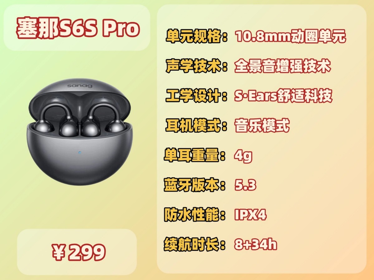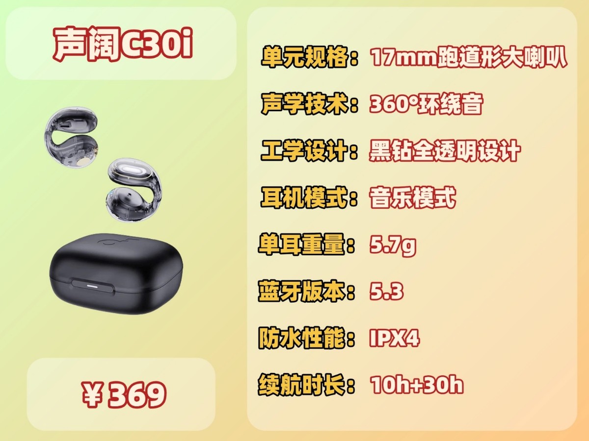这款耳机最了不起的还得是它的音质表现,经历过了三重重大升级之后,采用13mm双磁喇叭搭配石墨烯科技振膜与气旋式引擎腔体技术,磁场更强,承载的气流量也更大,也就带来了更澎湃的低音效果,推力更大,声音清晰充足、低音强劲,真的可以说和千元级耳机差不了多少。佩戴起来也很舒服,耳机单耳仅有5.1g,结构上采用的是前高后低2.5mm错位设计与∠12弧面耳托,耳机可以完美的贴合耳朵轮廓,即使是长时间使用也没有很明显的夹耳感。还支持最新的蓝牙6.0芯片,设备连接稳定,传输快速快,还支持自研的防漏音模式解决开放式耳机中最常见的漏音问题,另外,它还配备了四个麦克风能够提供十分稳定的通话效果,还支持智能一拖二功能与IPX5级防水,8+32小时的续航也足够用!喜欢就赶紧入手吧!