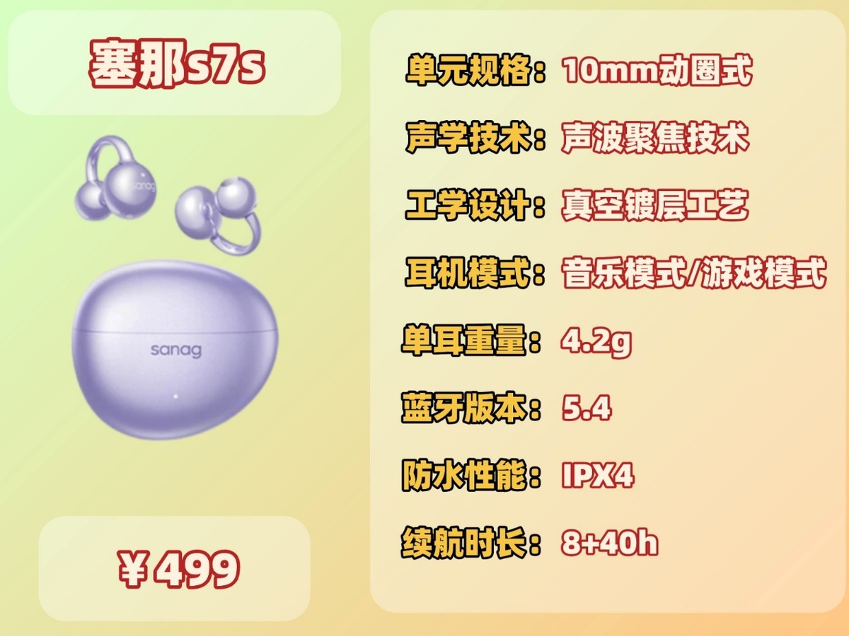 塞那的手感还是很不错的,上手很舒,耳机仓采用的是类鹅卵石外观设计简约精致,单耳仅4.2g实现无感佩戴。10mm动圈单元搭配APE全景音增强专利技术与声波聚焦技术,高音表现出色,低音下潜深沉,沉浸感十足,声音细节还原度高。蓝牙5.4芯片延迟低至40ms,设备连接流畅稳定,IPX4级防水满足日常需求,单耳续航8小时,搭配充电盒总续航达40小时。