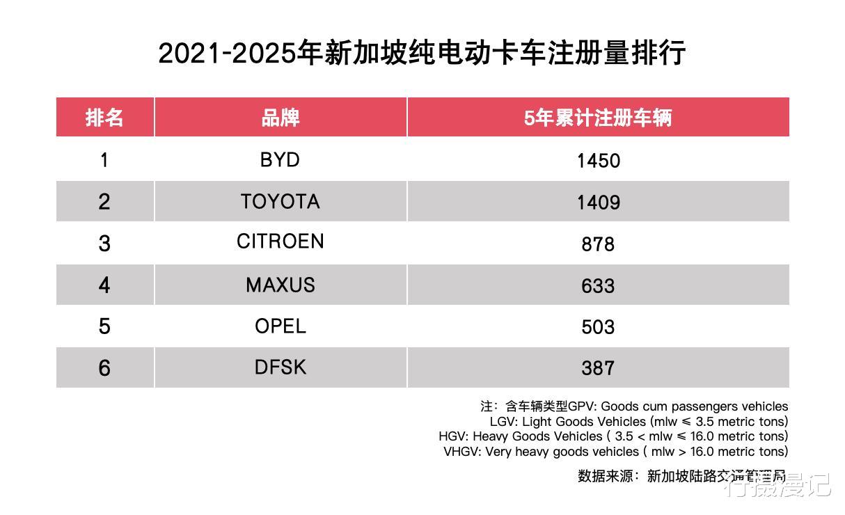在电动卡车领域,2020年,比亚迪进入新加坡市场,并开始向当地正式交付环卫车T9,成为当地首家销售电动卡车的企业。2021年至2025年期间,比亚迪纯电动卡车于新加坡的五年累计注册量达到1450台,在当地排名首位。