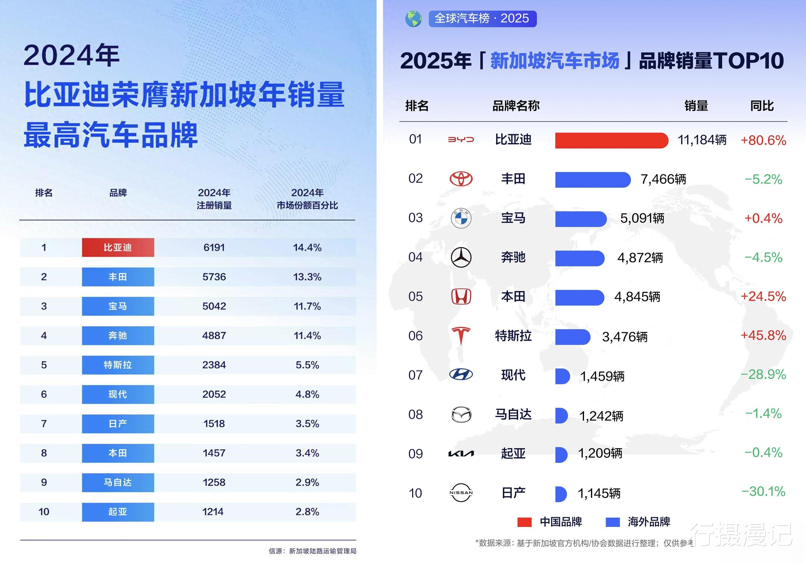 近期,行摄漫记《用镜头讲车》获取到新加坡陆路交通管理局的数据。2025年,比亚迪乘用车于新加坡市场的销售量达11184辆,较上一年同比增长80.6%,再度荣膺年度全品牌销量冠军。自2022年比亚迪正式进军新加坡乘用车市场以来,仅历经两年时光便成功登上销量榜首之位,用实力助力全球绿色出行。