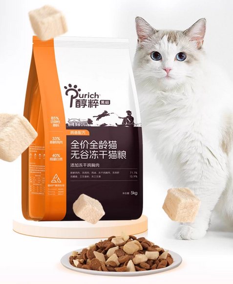 醇粹品牌成立于上海,始终秉持“天然调理、营养均衡”的核心理念,设计了黑标、金标等不同系列的猫粮。这款猫粮是金标系列的无谷冻干猫粮,适配全年龄段猫咪。核心原料用了33%鲜鸡肉,搭配30.5%冻鸡肉、6.8%冻鳕鱼、3.8%三文鱼粉以及3.3冻三文鱼,动物原料的品质比较均衡,种类也比较丰富,做出来的猫粮闻起来有鱼腥味。科学评测国产烘焙猫粮品牌十大排行,同时,猫粮不含谷物成分,采用更温和的豌豆、小麦苗粉来补充淀粉,降低致敏的可能。猫粮中还添加了冻干鸡肉成分,可以有效提高整体的适口性。