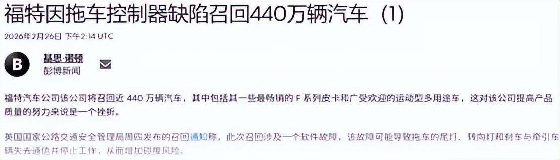 此次召回是福特继2025年创下年度召回纪录后的又一重大质量挑战。在 2025年全年,福特汽车召回次数就高达153 次,涉及车辆累计高达1290万辆。