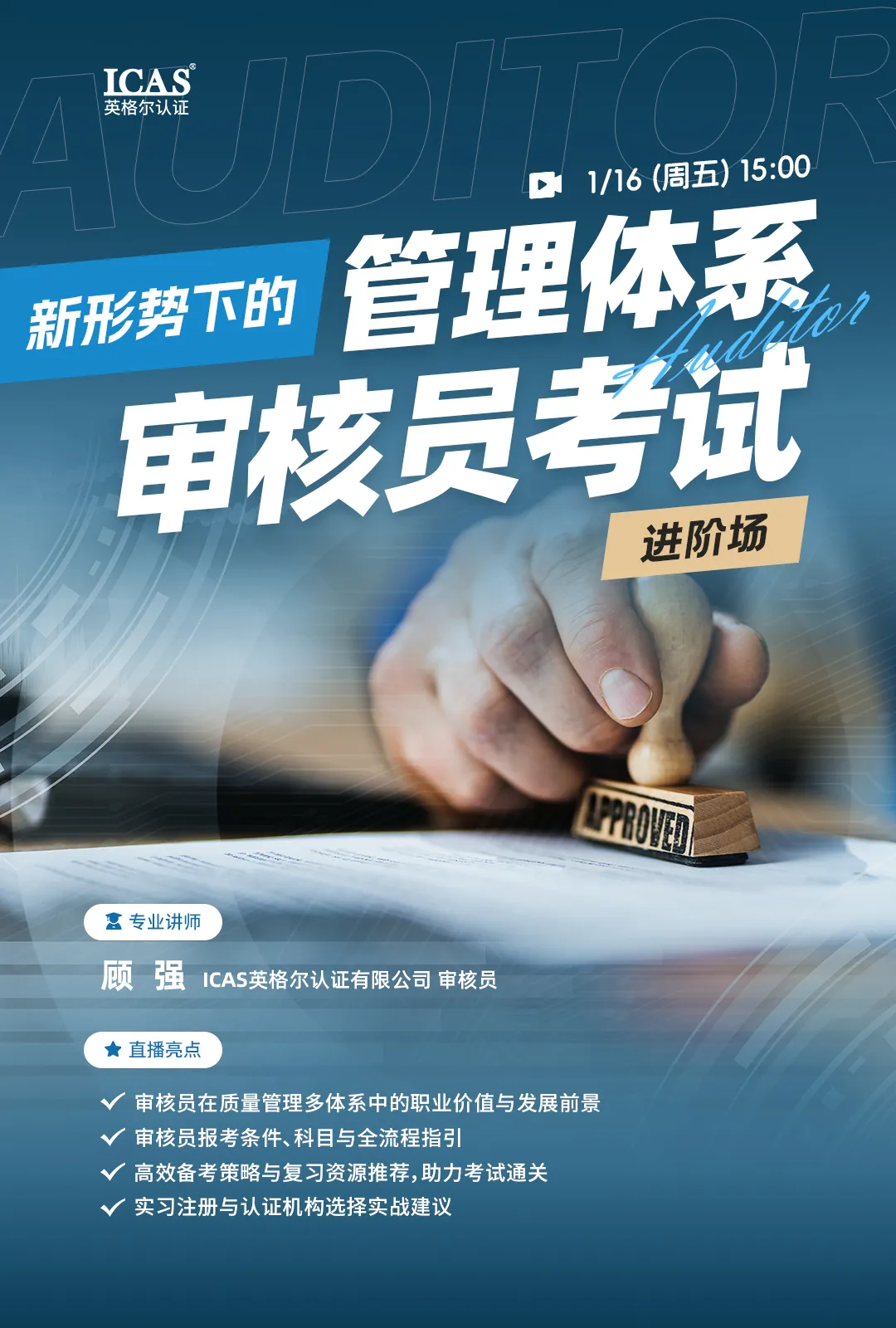 2026年1月16日(周五)15:00,ICAS英格尔认证特邀资深审核员顾强,重磅开启《新形势下的管理体系审核员考试》专题直播进阶场。
