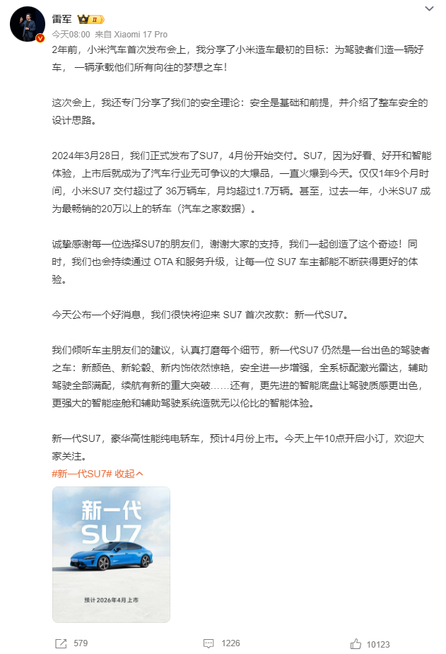 新款小米SU7或将扭转下滑趋势。“新一代SU7仍然是一台出色的驾驶者之车。”雷军说:“新颜色、新轮毂、新内饰依然惊艳,安全进一步增强,全系标配激光雷达,辅助驾驶全部满配,续航有新的重大突破···”