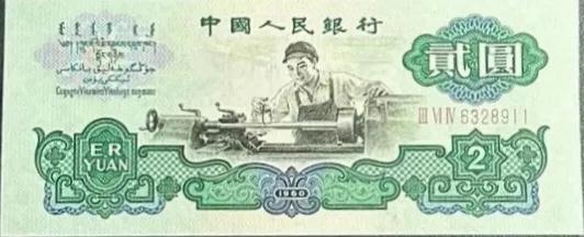 2元纸币正面为车床工人:第三套2元人民币(俗称“车工两元”)当前价值在100元至5000元之间,具体取决于水印类型、品相和评级。