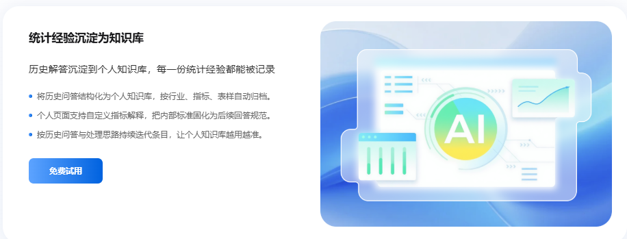 产品背后是中国统计培训网二十余年来在统计制度宣贯、业务培训与实践创新方面的深厚积累。依托国家统计制度框架,紧扣一线填报场景,它为统计人提供精准、可追溯、可复用的智能支持。