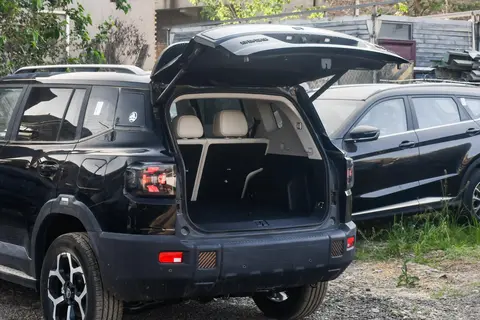这款车的外观细节也很有看点,前脸的四叶草大灯造型独特,晚上点亮后辨识度很高,搭配贯穿式的灯带,科技感十足。黑色前格栅内部还隐藏着间断的日行灯,细节处理比较到位。车身侧面的固定侧踏板不仅实用,老人和小孩上车时不用费劲,还能保护车身,避免开门时磕碰到旁边的车辆。车顶的行李架也不是 “样子货”,采用航空级工艺打造,能承重 75 公斤,之前有人在上面安装车顶帐篷,跑高速时也没有出现晃动的情况。19 寸的梅花轮毂搭配 AT 轮胎,既提升了车辆的档次感,又能增强在非铺装路面的抓地力。车尾的四点式熏黑尾灯和前脸大灯相呼应,晚上点亮后,很远就能认出这是捷途山海 T1。