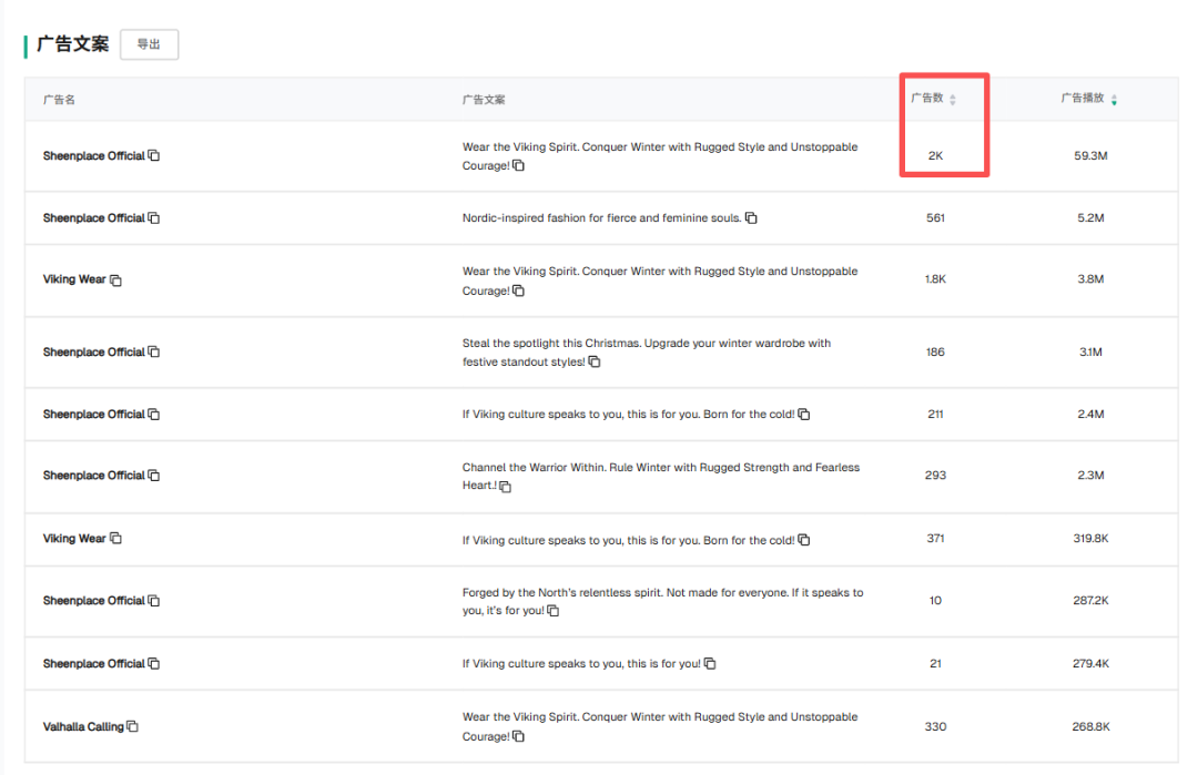 这单条文案关联了2000条广告素材,播放量59.3M。