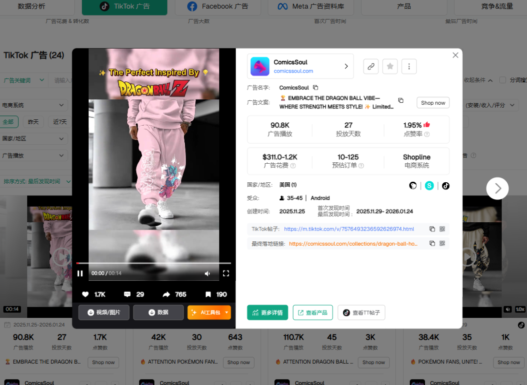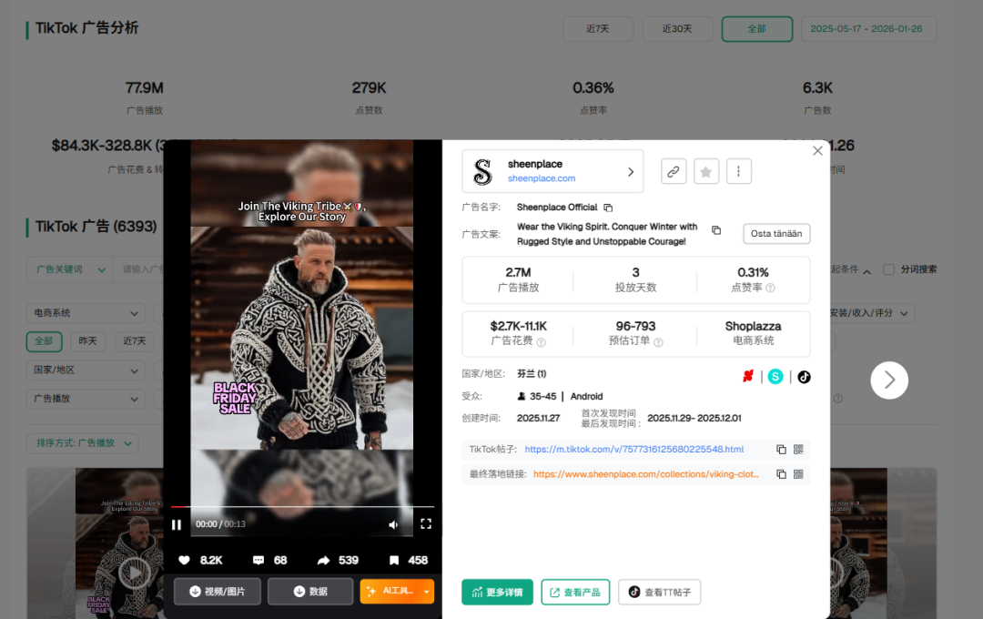 根据Pipiads的数据分析,这家服饰独立站单店投放了总计6393条广告,总播放量达到7790万次。