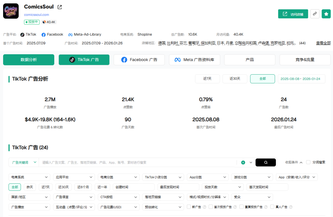 这家店累计投放10,600条广告,近期播放量达到270万。Pipiads数据显示,他们的流量曲线呈现明显的"锯齿状"波峰——平时保持低强度测试,关键时刻突然爆发,这正是AI产能灵活性的体现。