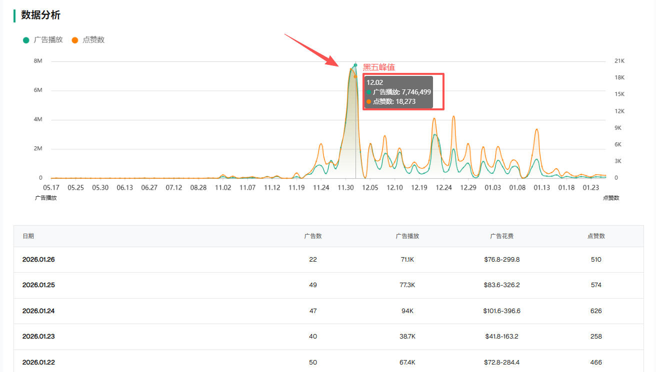 而在黑五期间他们的流量曲线几乎垂直拉升,这背后只有一个解释:AI算力全开,瞬间向市场倾泻数百条素材。