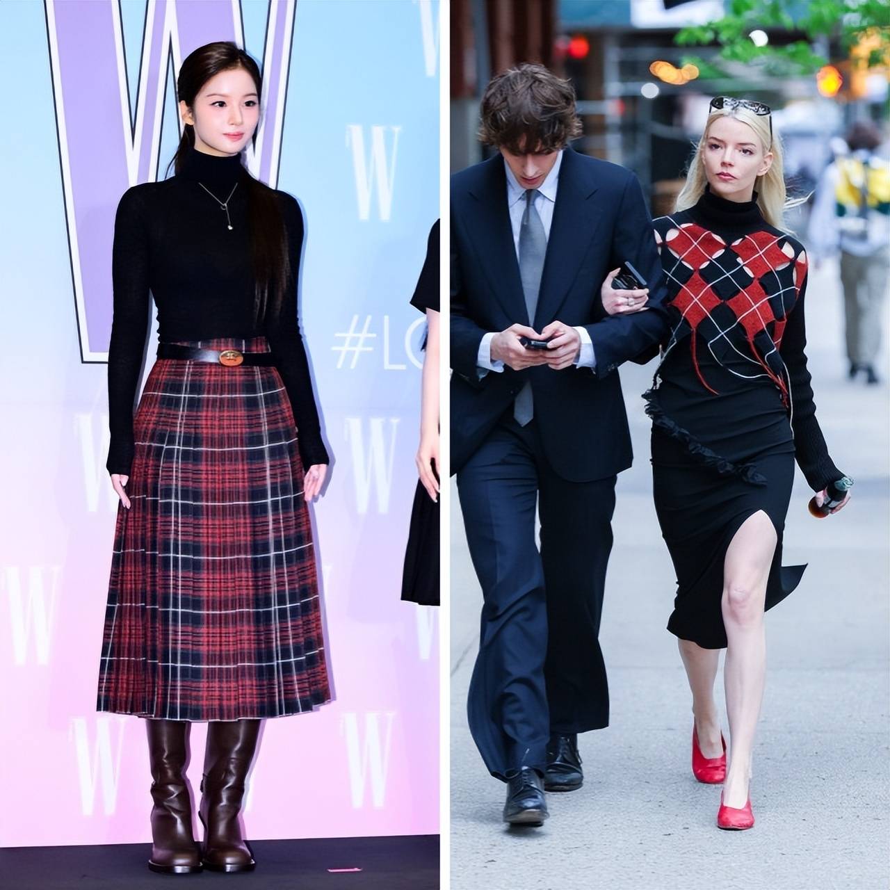 安雅轻松驾驭了难度颇高的造型:黑色与红色的菱格纹高领毛衣,搭配以高开衩为特色的紧身裙,平底鞋则是红色的Staud。
