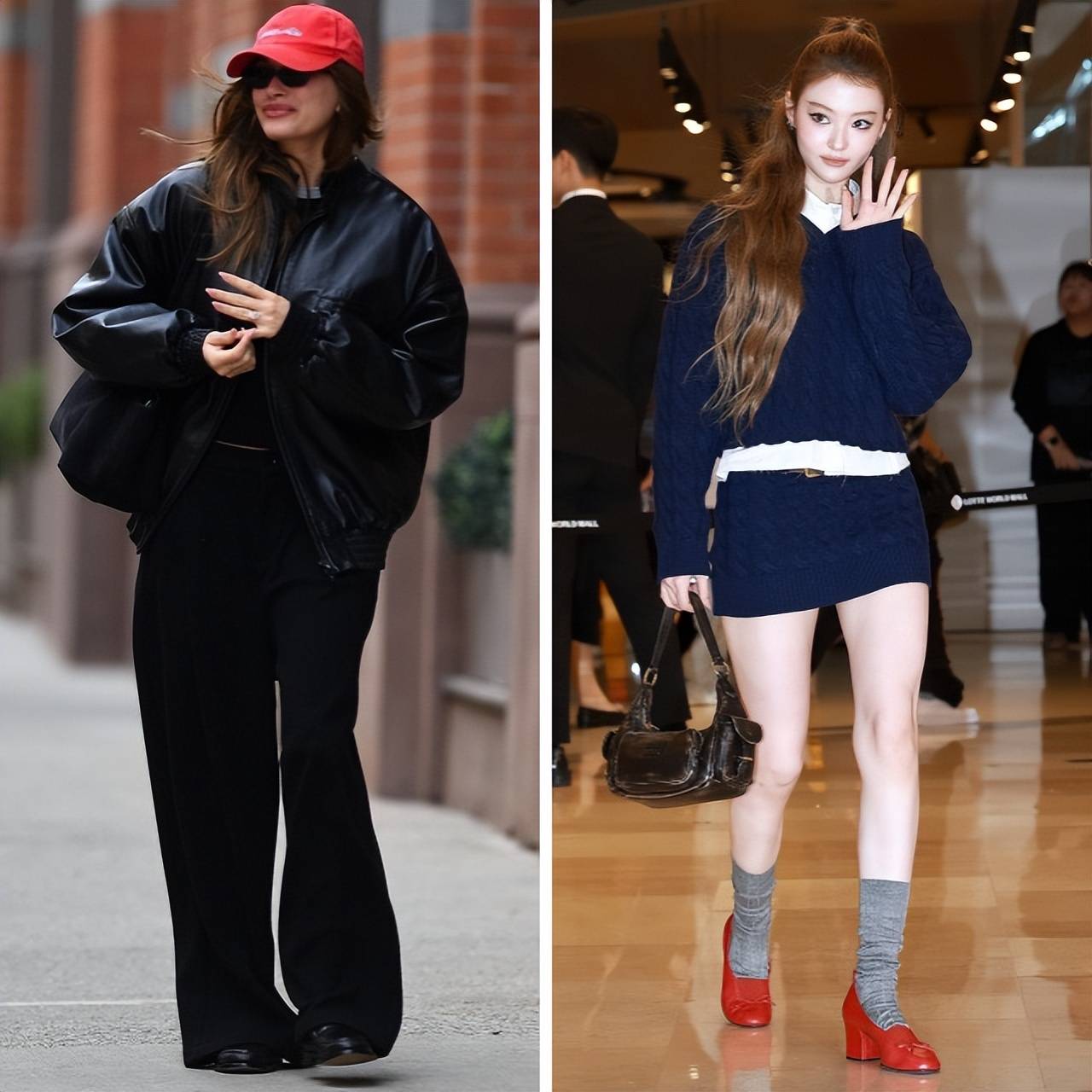 在韩国举行的缪缪活动上亮相的艾拉,海军蓝的针织套装,搭配灰色袜子和红色鞋子的预科生风格。