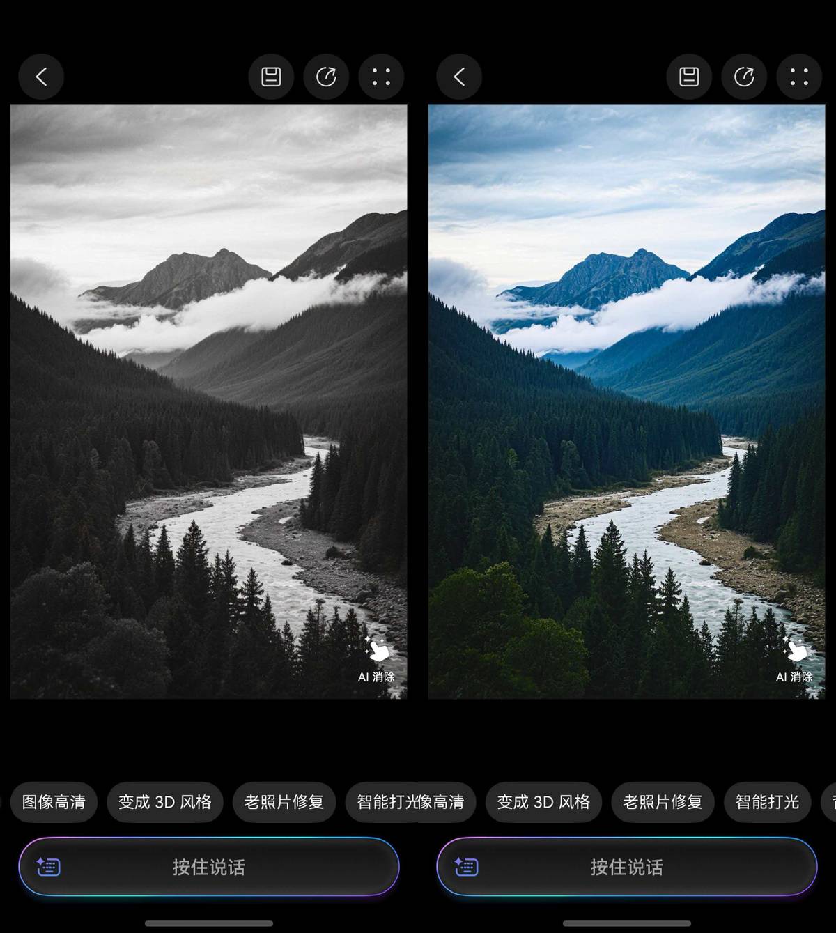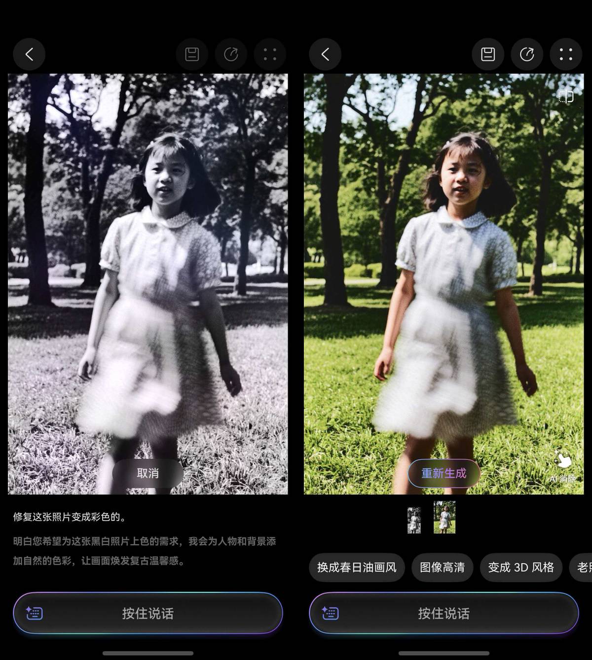 我印象比较深刻的,还是华为手机里的小艺,谁能想到现在小艺除了常规日常对话问答外,已经变成了修图大师?住在我隔壁的王阿姨在社区服务站工作,十多年来一直有着摄影的爱好。自从她换了华为后,王阿姨就靠着小艺解锁了摄影新玩法,这一天天在社区活动中心跟我们显摆。有次她给小艺发了一张黑白照片,对着手机说:“修复这张照片”,小艺不仅听懂了,还立马把照片变成了彩色。按王阿姨的话来说,这简直就像带了个随身的修图助手。