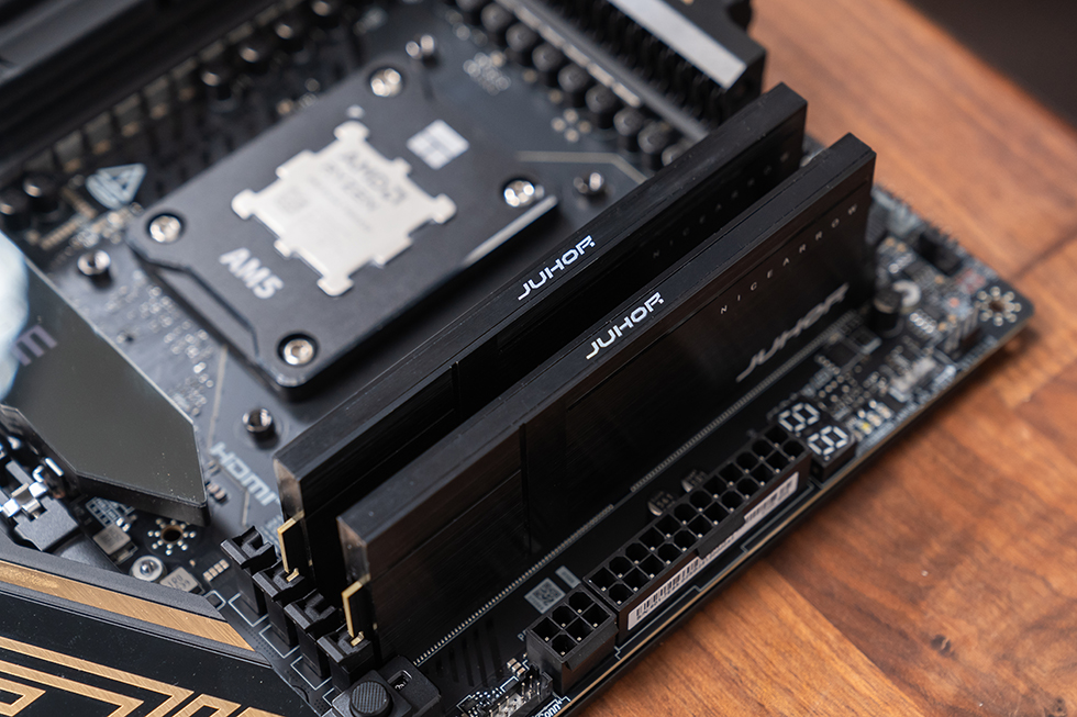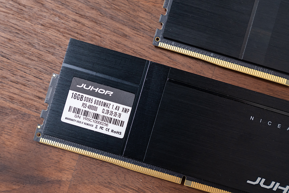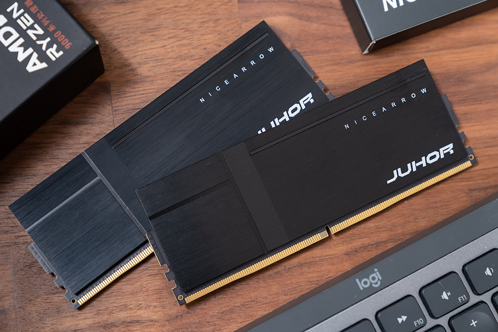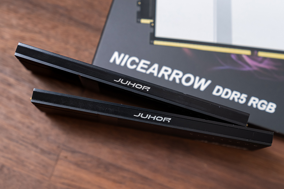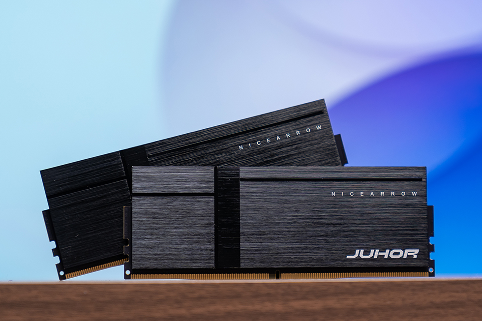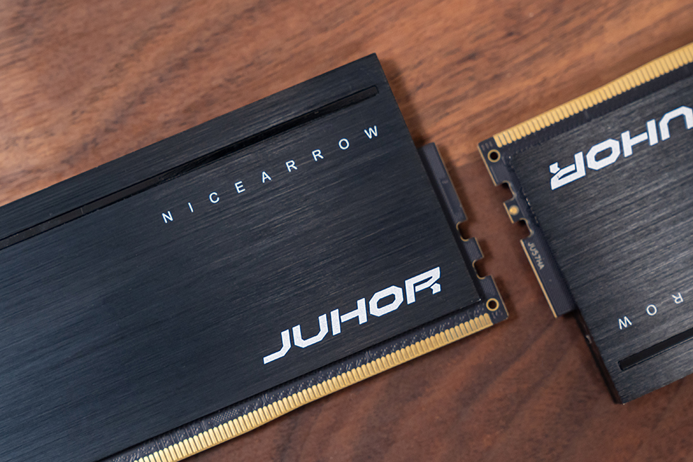 马甲采用分段式切割设计,线条干净利落,右下角印有金属质感的JUHOR品牌LOGO,简约中透着高端感。散热马甲与PCB之间填充高导热硅胶垫,能快速导出颗粒热量,保障内存长时间高负载稳定运行。