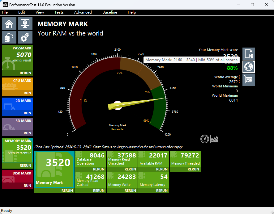 默频下内存频率为4800MHz,时序自动调节为CL40-40-40-77,主要为保障兼容性。AIDA64内存测试数据显示:读取速度约55783 MB/s,写入速度约63909 MB/s,拷贝速度约52911 MB/s,延迟87.5ns。PerformanceTest 内存测试3520分,通过7-Zip基准测试,总体评分提升至128GIPS,压缩和解压缩速度表现稳定.