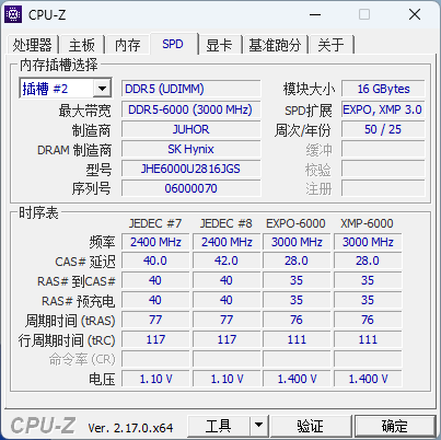 硬件配置上,内置独立PMIC电源管理芯片,可实现精细电压调控,配合On-Die ECC内存纠错机制,大幅提升高频运行稳定性;单面颗粒设计简化信号传输路径,进一步优化阻抗控制,为超高频率运行提供保障。闪存性能的核心取决于颗粒品质,从CPU-Z可以看到,玖合异刃 6000 C28选用的海力士原厂A-Die颗粒,是目前DDR5内存领域的顶尖颗粒之一,其性能表现与兼容性均处于行业第一梯队。该颗粒的核心优势在于低时序潜力与超频能力,能在6000MHz频率下稳定运行于CL28-35-35-76 超低时序,这一表现通常只有高端旗舰内存才能实现。