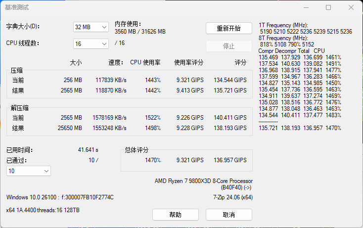 开启AMD EXPO后,内存自动运行于6000MHz频率,时序锁定为CL28-35-35-76,电压1.4V。此时性能迎来大幅提升:AIDA64测试中,读取速度提升至63089 MB/s,写入速度达87844 MB/s,拷贝速度57749 MB/s,延迟降至69.7ns,相比默频读取增幅13%,写入增幅37%,复制增幅9%,延迟降低20%。PerformanceTest 内存测试3976分,通过7-Zip基准测试,总体评分提升至136GIPS,压缩大文件时效率明显提高