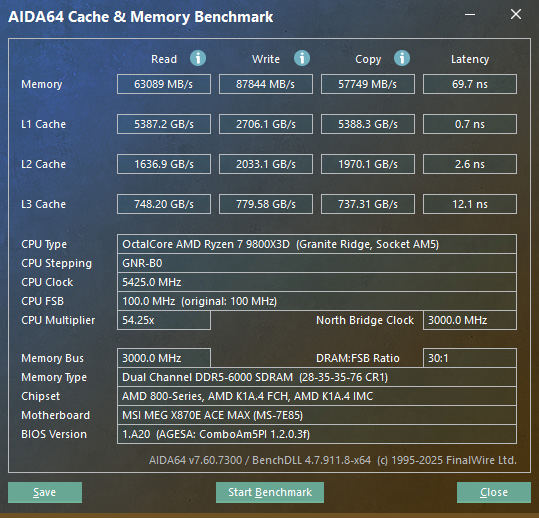 为全面测试这款内存的性能表现,本次搭建了主流高端平台:CPU为AMD锐龙7 9800X3D,主板为微星MEG X870E ACE MAX战神主板,操作系统为Windows 11 24H2最新版本,测试环境为22℃,分别测试默频、EXPO(6000MHz)及手动超频状态下的性能。