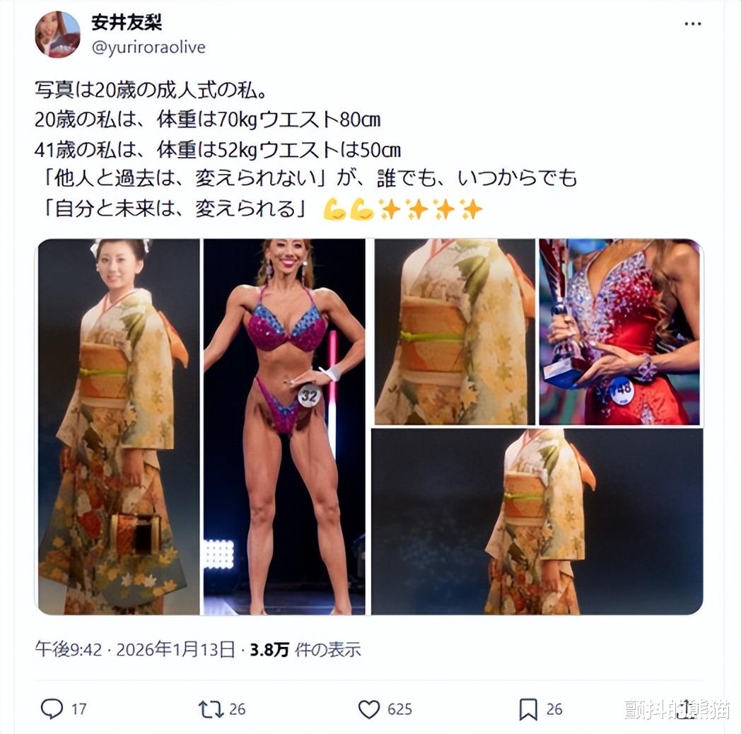 安井友梨在发文中写道:“20岁的我,体重70公斤腰围80厘米;41岁的我,体重52公斤腰围50厘米。‘他人与过去,无法改变’,但无论何人、何时起,‘自己与未来,皆可改变’。”这番将目光聚焦于可改变之事、凭借努力淬炼出健美体态的感悟,想必打动了无数人的心。