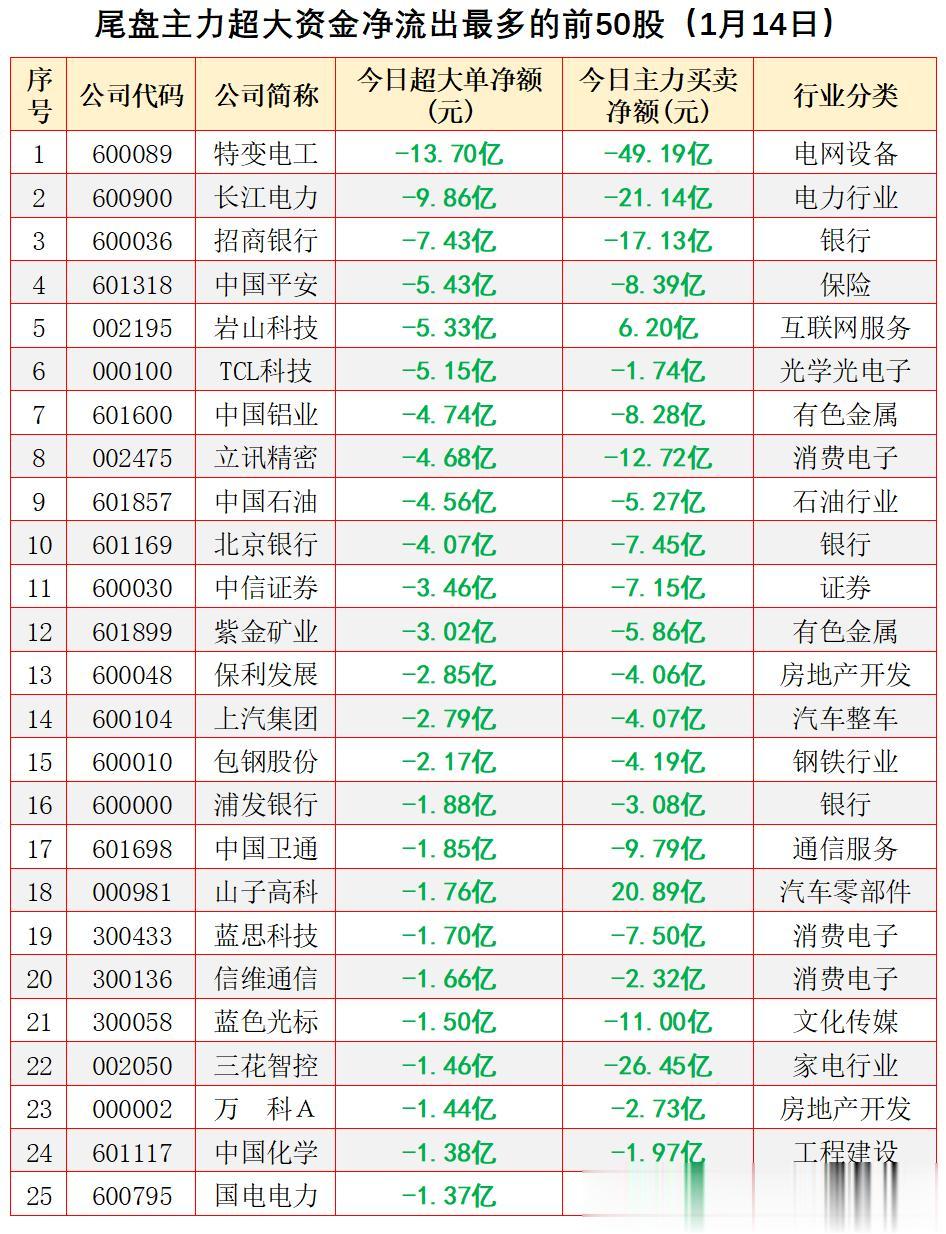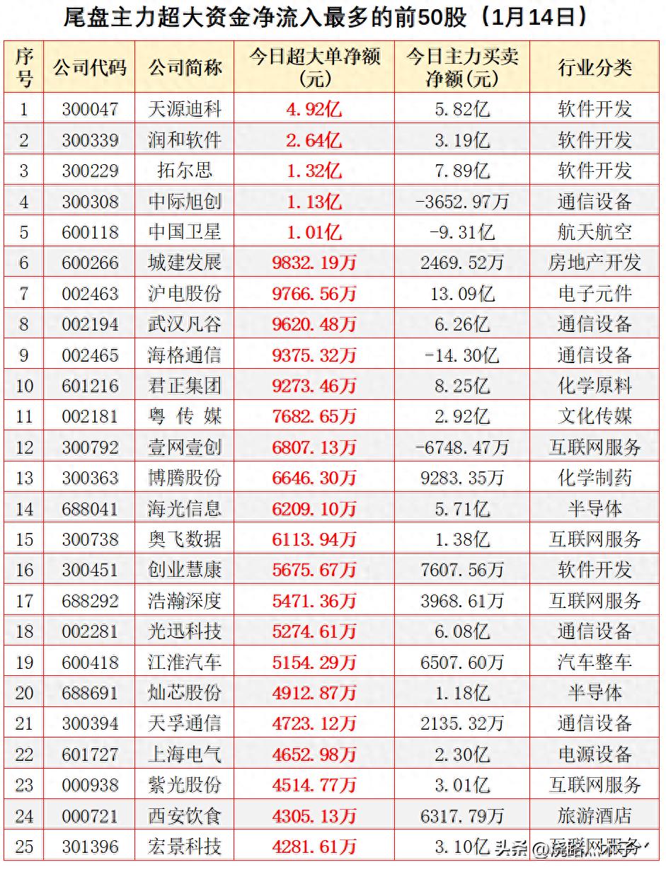 市场成交再度刷新历史高位,主力机构顺势进行调仓操作,资金弃高就低的流向轨迹清晰可辨。在尾盘的最后30分钟,主力超大资金净买入与净卖出最多的各50只个股浮出水面。这些个股是否潜藏短期机遇或风险,建议收藏起来甄别研判。