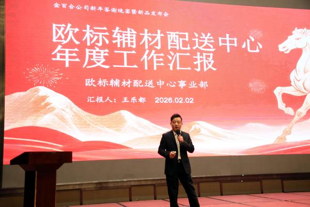 鑫百合门墙柜一体化负责人吴勇的汇报令人耳目一新,他详细阐释了"一体化"解决方案如何为客户创造更大价值。最后登台的欧标辅材配送中心经理王乐都,系统介绍了该中心在标准化建设、供应链优化等方面的探索与实践。四位负责人的汇报不仅展现了各事业部的亮眼业绩,更勾勒出金百合未来发展的清晰蓝图。