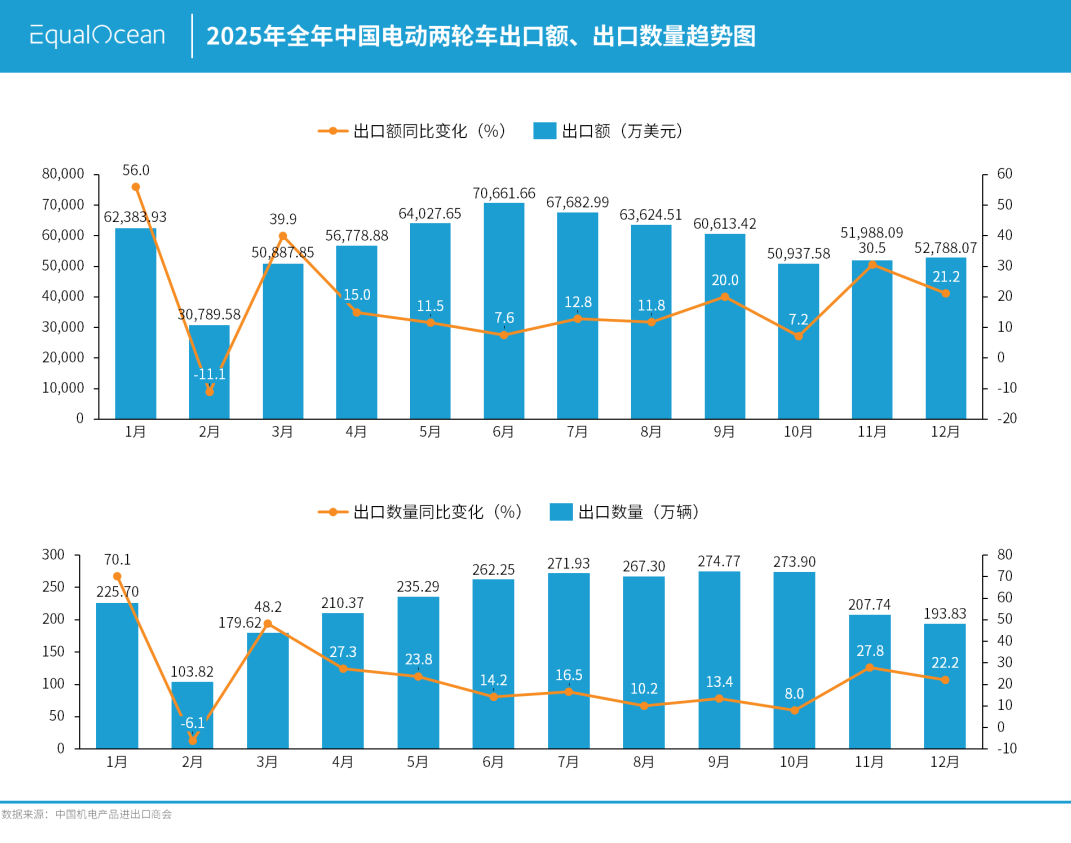 从出口数据来看,电动微出行仍处于规模扩张阶段。2025年,中国电动两轮车出口额和出口数量全年保持正增长,上半年在海外需求修复和渠道持续铺货的带动下,同比增速一度达到70%,彰显了中国制造在全球市场的供给优势。然而,2025年末的出口单价虽回到年初水平,但这并非简单的价格回归,而是行业经历一轮阶段演进后的调整。10月单价曾跌至185.97美元,经历价格战洗礼后,行业完成去库存出清,年末单价回升依靠的是高端智能化产品推动的结构性替代。这表明电动微出行出海正式从拼规模时代迈入拼能力时代。