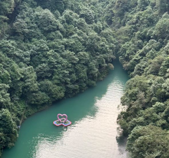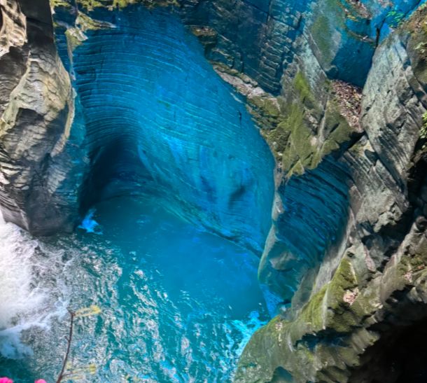 谷底的“地之心”深潭,碧绿如翡翠,形状似心脏,仿佛是大地跳动的脉搏。而天浴瀑布则从高处奔腾而下,水花飞溅,在阳光的照耀下,形成一道道绚丽的彩虹,为这处秘境增添了几分梦幻色彩。