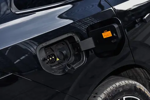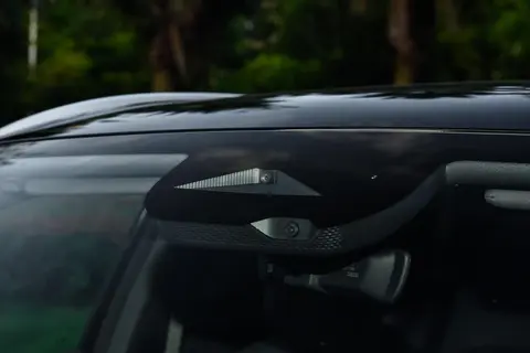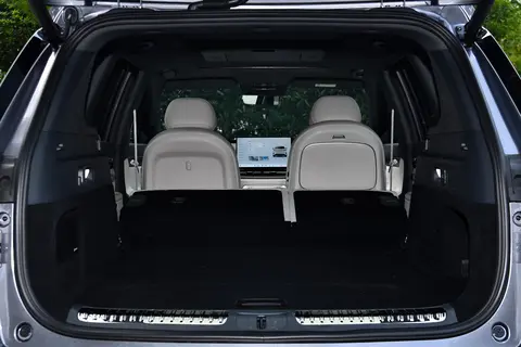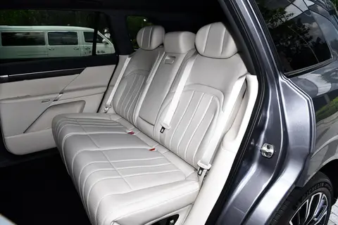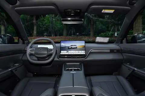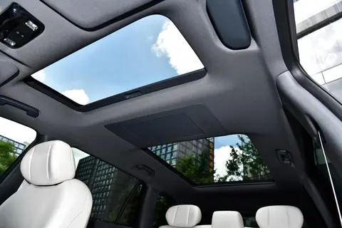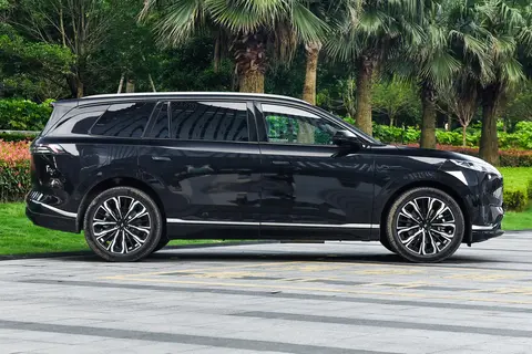 侧面设计呈现出黄金比例与实用配置的完美结合。车身线条采用贯穿式腰线搭配外扩轮眉,营造出厚重饱满的视觉效果;悬浮式车顶和隐藏式门把手的设计,将风阻系数降低至 0.28Cd。D 柱侧窗还集成了充电指示灯。全系标配 21 英寸多辐式铝合金轮毂,部分车型搭载了米其林 PS EV 或马牌 EC7 轮胎,兼顾了静音与抓地力。后排升级了双层夹胶隐私玻璃(紫外线阻隔率高),并标配倒车后视镜下翻功能,提升了停车的便利性。