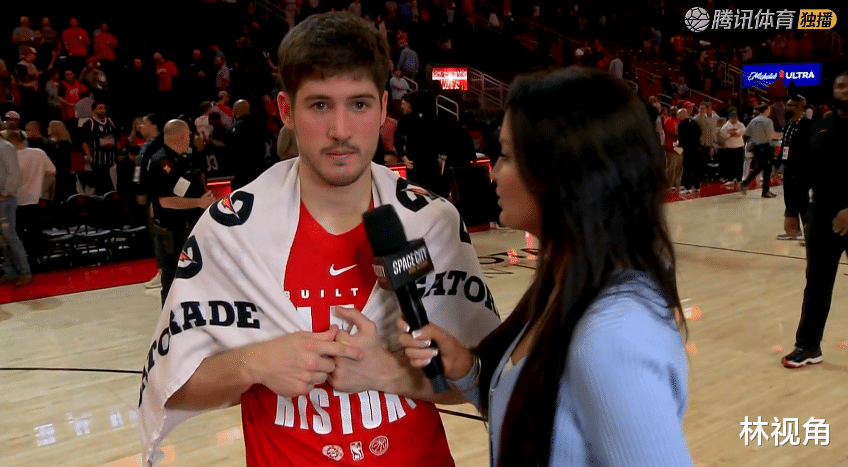 小谢在场边接受记者采访,今天小谢毫无疑问是火箭最靓的仔!