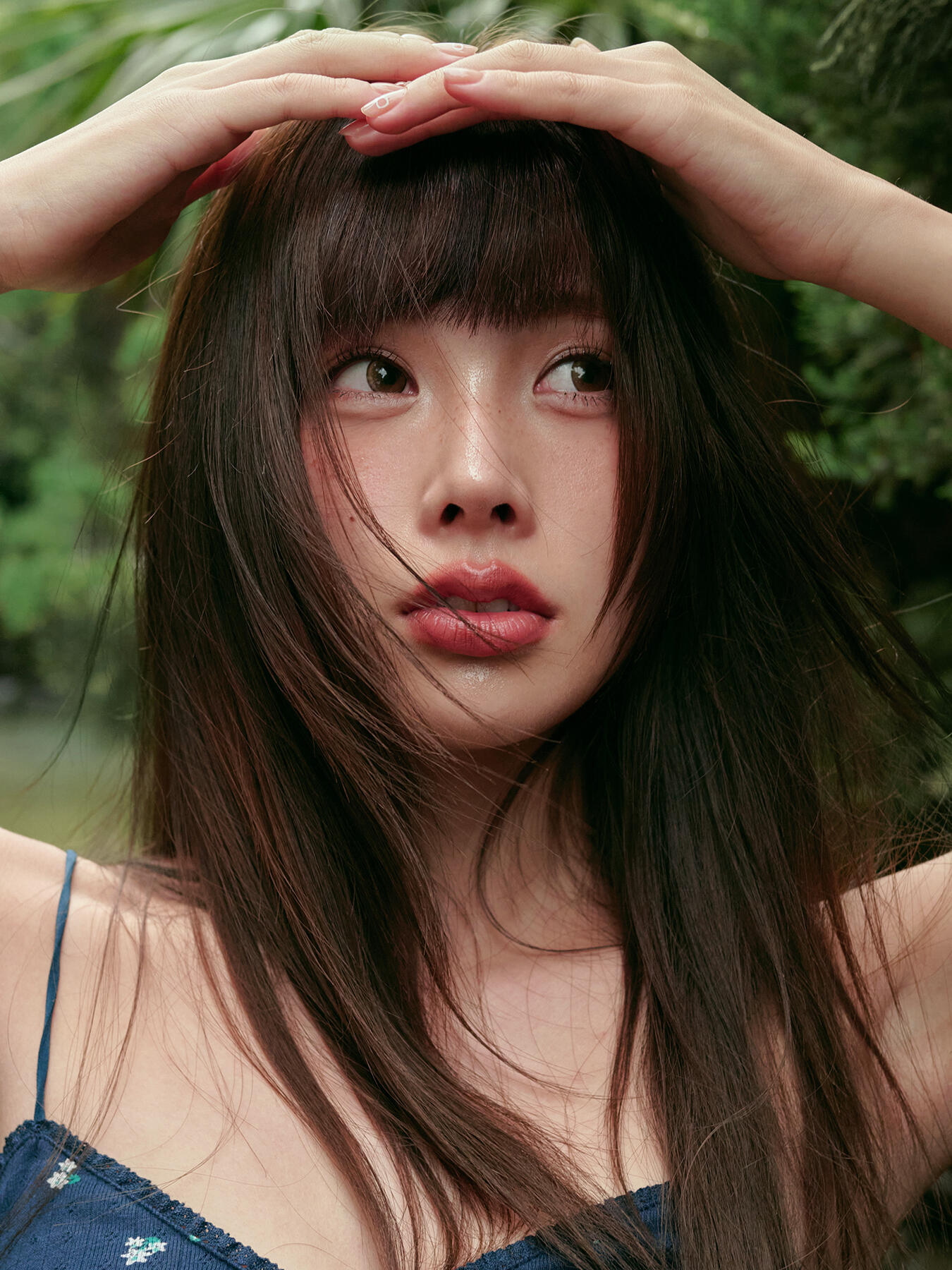 二、光线利用:抓住“黄金时段”,善用光影层次自然光下拍摄特写,光线的时机和方向至关重要。一天中最适合拍摄的时段是日出后和日落前的1-2小时,此时的光线角度低、光质柔,能在面部形成细腻的光影层次。这组作品中的散射光效果,可能是在阴天或树荫下拍摄的结果,这种光线能均匀覆盖面部,避免硬光造成的阴影。想要增加画面的立体感,可以尝试让光线从侧方或侧上方照射,比如在拍摄仰拍特写时,利用侧逆光打亮发丝和面部轮廓,既能强化质感,又能营造氛围感。需要注意的是,要避免让光线直接照射模特的眼睛,以免产生刺眼的反光。