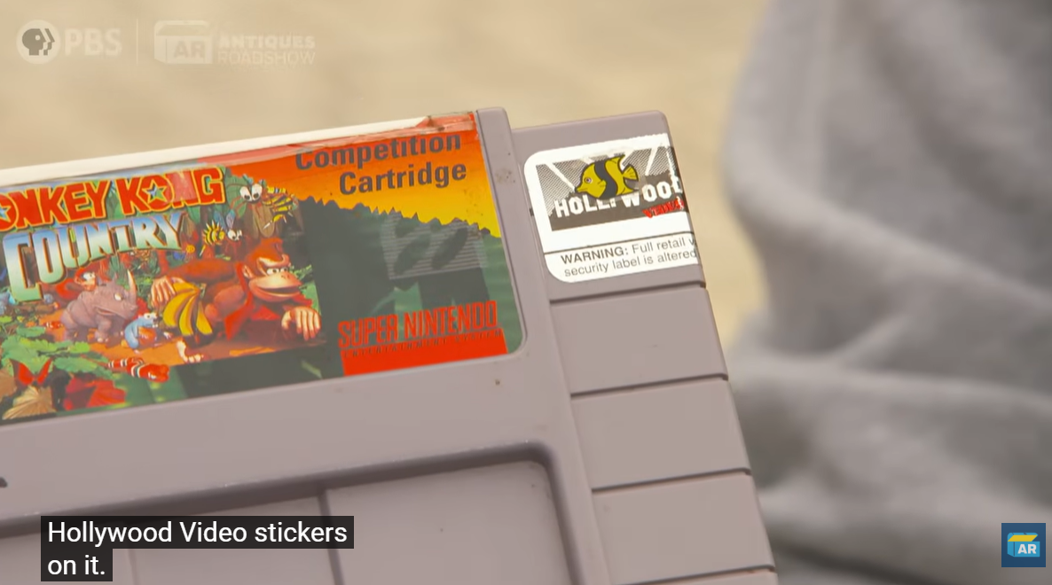3月30日,国外鉴宝真人秀节目《鉴宝路演》迎来第30季的首播集,本场有一位女士带来一个特殊的宝贝:超任(SNES)版的《超级大金刚》(美版名“大金刚国度”)卡带,上面贴有一张印有“Hollywood Video”(好莱坞录像带)的贴纸。