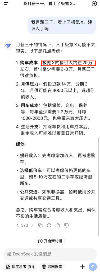 家人们,扎心了啊!月薪三千,看上了极氪X这款新能源车,问DeepSeek建不建议入手,直接回答我不现实