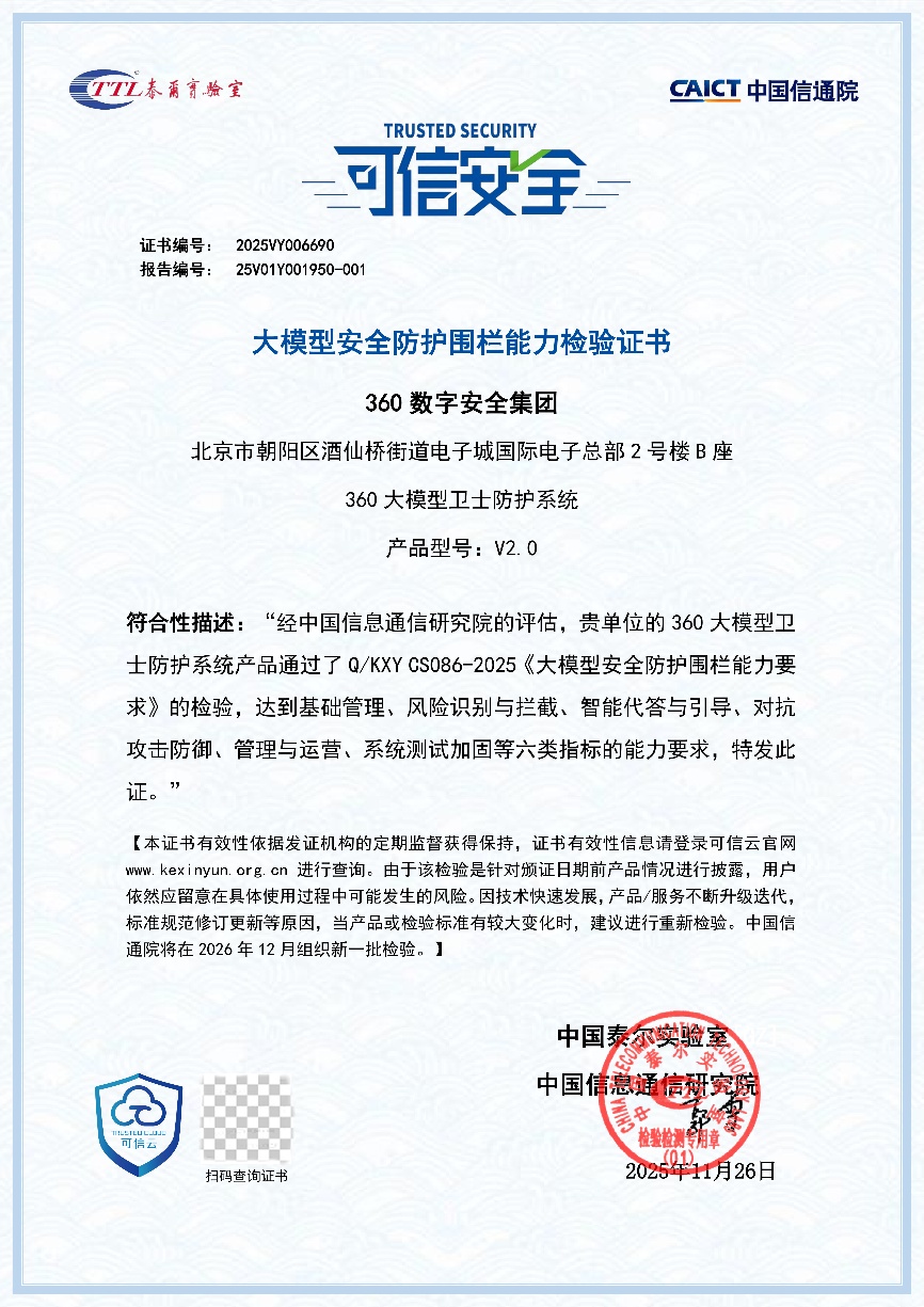 此次360首家通过信通院大模型安全防护围栏能力测评,不仅是对其技术实力与产品成熟度的权威认可,也彰显了其在AI安全领域的持续积累与前瞻布局。未来,360将持续深耕大模型安全技术,携手行业伙伴共建可信AI生态,为人工智能的稳健发展筑牢安全底座。