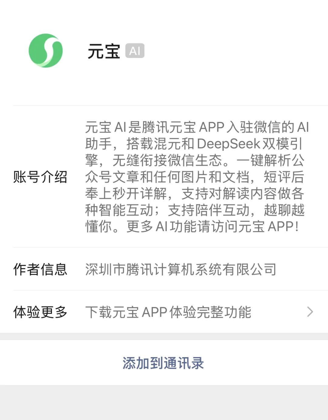 此前,微信上线首个AI助手元宝。用户在微信添加元宝为好友后,就可以与其聊天,可以一键解析公众号文章和任何图片和文档,但不支持视频和音频。