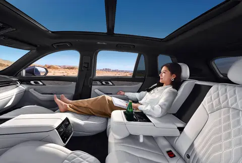 舒适配置给得很足,全车都是 Nappa 真皮座椅,前排支持 12 向电动调节,还有加热、通风和 8 点式全背面按摩功能;二排也新增了通风和 8 点式按摩,再加上原本就有的加热功能,还有四温区独立空调和第二排遮阳帘,不管是老人还是孩子,都能找到舒服的乘坐姿势。新增的副驾电动腿托也很实用,长达 280mm,最大能调到 62.5°,就算身高 180cm 也能舒展身体,一键开启休憩模式,午休或者长途旅行时能好好放松一下。