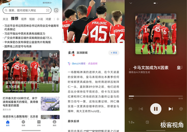以前刷新闻,只能盯着屏幕逐字看,眼睛越看越累,现在点开资讯页面的 “(Beta)AI 播客・点击收听”,就能解放双眼。“主播”不是机械念稿,而是一男一女的趣味对谈,就拿这篇关于足球的文章来说,没有生硬的解读,反而像听相声一样有乐子,又能把体育新闻资讯吸收进来,在“主播”一来一回间的趣味对话中拓宽视野。