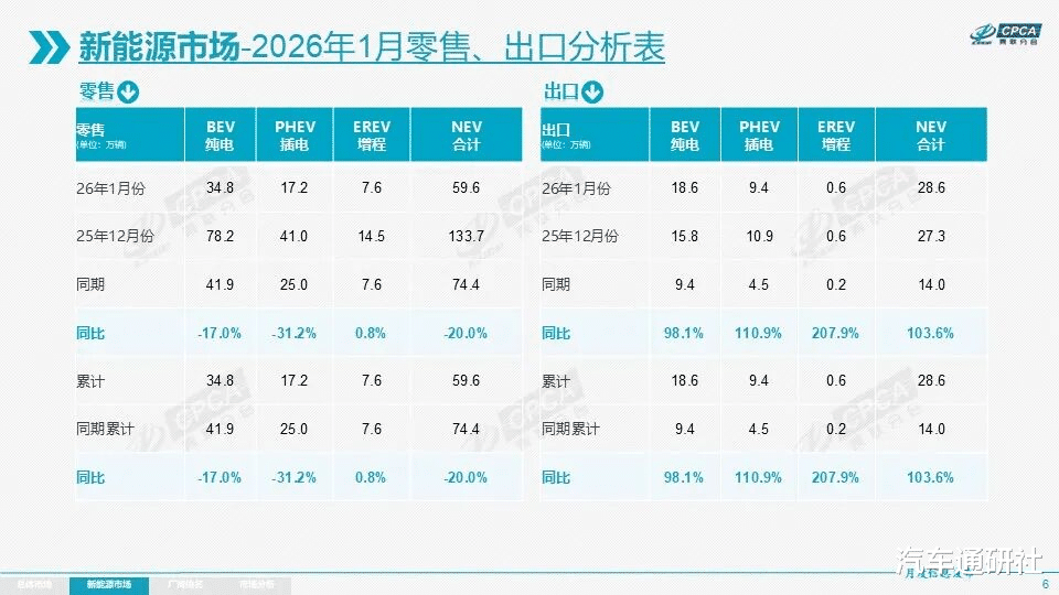 先是2026年1月的销量数据,全国乘用车市场零售达154.4万辆,同比下降13.9%,尤其是新能源汽车,2026年1月的零售销量仅为59.6万辆,同比下降20%。
