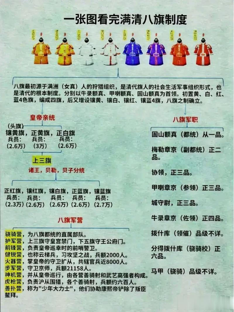 不是一成不变——从四旗到八旗,从旗主到皇帝直辖,八旗一直在调整名称会误导——“正”不一定正统,“镶”不一定次要,一切取决于权力归属特权导致衰落——上三旗的特殊待遇最终加速了整个八旗系统的腐化当1912年清朝灭亡时,无论镶黄旗的贵族还是正蓝旗的兵丁,都同样面临“旗人生计”问题。三百年的兴衰昭示着一个简单道理:任何制度如果固化为特权壁垒,无论当初多么精锐,最终都难逃僵化衰败的命运。